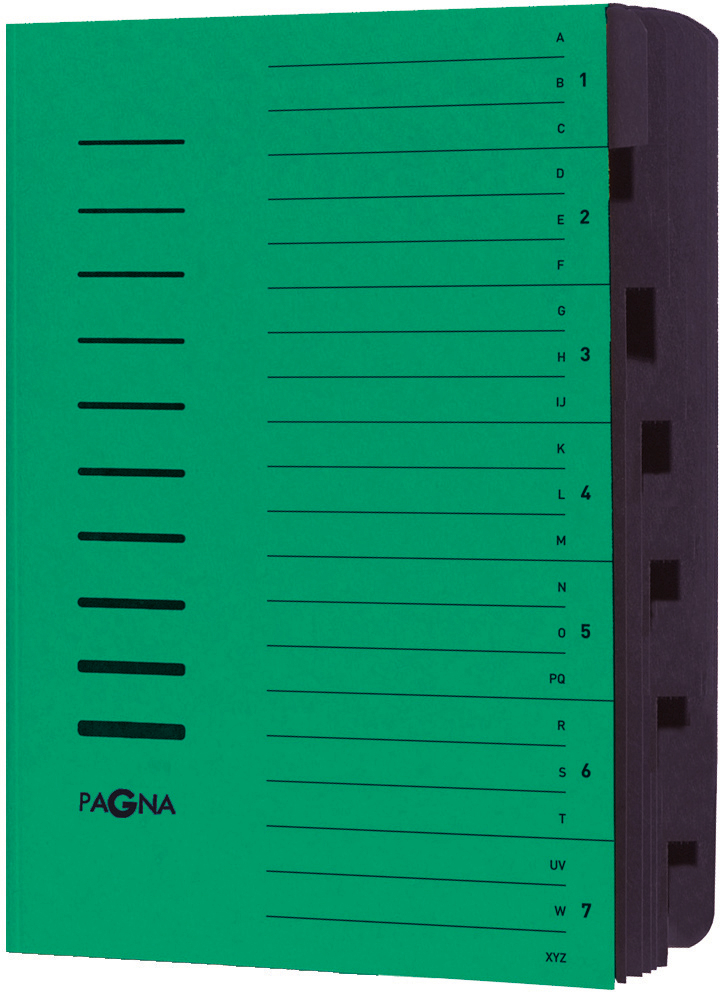 Ordnungsmappe, für Dokumente im Format A4, 7 Fächer, grün, aus strapazierfähigem Pressspan, mit schwarzem Eckspanngummi, 2 Schaulöchern im Buchblock, schwarzem Griffregister aus stabilem Karton für schnellen Zugriff auf Unterlagen, Aufdruck 1-7 und A-Z auf dem Deckel, deutsches Alphabet, individuell beschriftbar