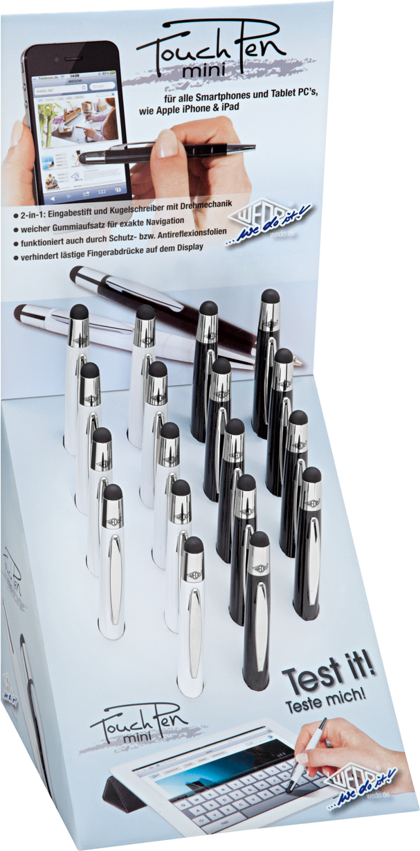 Eingabestift mit Kugelschreiber für alle Smartphones und Tablet PCs. Der weiche Gummiaufsatz ermöglicht das treffsichere Verfassen von Nachrichten und bequeme Navigieren und Scrollen ohne lästige Fingerabdrücke auf dem Display. Funktioniert auch durch Schutz- bzw. Antireflexionsfolien. Mit dem Touch Pen haben Sie gleichzeitig auch immer einen Kugelschreiber zur Hand, ausgestattet mit Drehmechanik, praktischem Clip und einer blauen Metallmine im D1-Format. In sportlichem Design mit zwei horizontalen Gravurlinien auf der hochglänzenden Oberfläche und chromfarbene Zierteile.