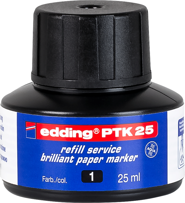 Zum Nachfüllen der Pigmentmarker edding 30 und 33. Permanente, extrem lichtbeständige, geruchsneutrale, wassergelöste Pigmenttinte in einer Flasche mit Kapillarsystem. Marker einfach mit der Spitze nach unten für mindestens eine Stunde, idealerweise jedoch über Nacht, in die Refillflasche stellen. Danach ist der Marker wieder schreibbereit.