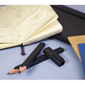 Rechteckiger Querschnitt mit abgerundeten Kanten, in Zedernholz eingefasste hochwertige 2B-Mine. Lässt sich mit der Kappe an jedem Moleskine-Notizbuch befestigen. Bleistifte: Rechteckiger Korpus aus Zedernholz. Hochwertige 2B-Mine - 3 mm. Mattschwarzes Finish. Schwarze Kappe aus ABS-Kunststoff mit lackiertem Metallclip. 24 Klebeetiketten zum Personalisieren der Kappe. Bleistiftspitzer: Konzipiert für Moleskine-Bleistifte. Mattschwarzer ABS-Kunststoff. Hochwertige Klinge aus deutscher Herstellung; Öffnung 12,5 mm.