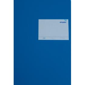 Das Geschäftsbuch mit blauem Kunststoff-Einband und aufgeklebtem Schild ist kariert.