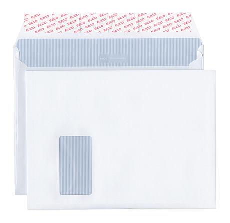 Documento C4 plus-Kuvert mit der 20 mm Seitenfalte von ELCO mit Fenster links und mit Haftklebeverschluss in der 200 Stk.-Box. Das FSC-Couvert für anspruchsvolle Briefschaften. Der charakteristische, blaugraue Innendruck "ELCO documento" verhindert die Durchsicht.