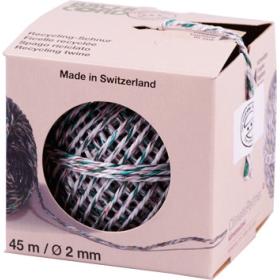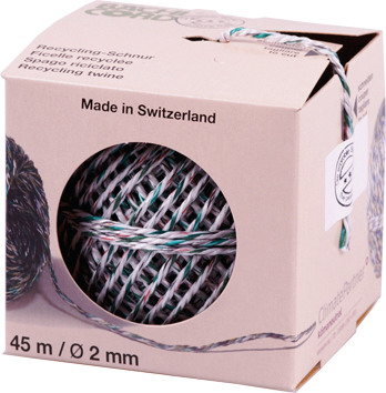 Die Recycling-Packschnur in der praktischen Kartonbox. Das integrierte Messer sorgt dafür, dass sie nie mehr nach einer Schere suchen müssen.