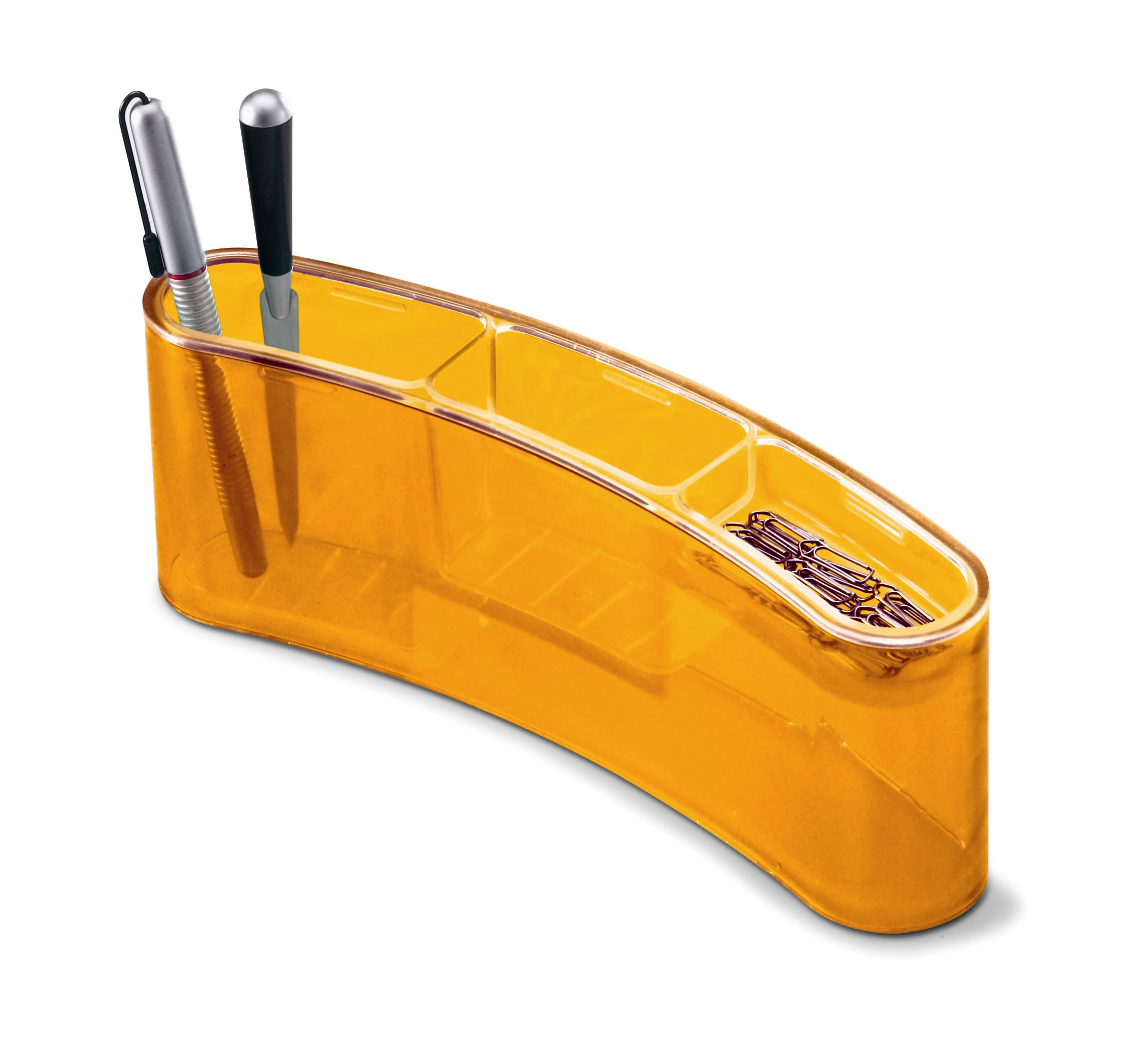 Schreibgeräteköcher styropen in schwungvollem Design und trendiger Farbe - ein echter Hingucker auf Ihrem Pult. Transparenter Einsatz mit 3 verschieden tiefen Fächer für Schreibgeräte, Haftnotizen, Büroklammern usw.