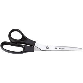Dies ist eine Büroschere mit rostfreien Klingen und schwarzem Kunststoff-Griff.