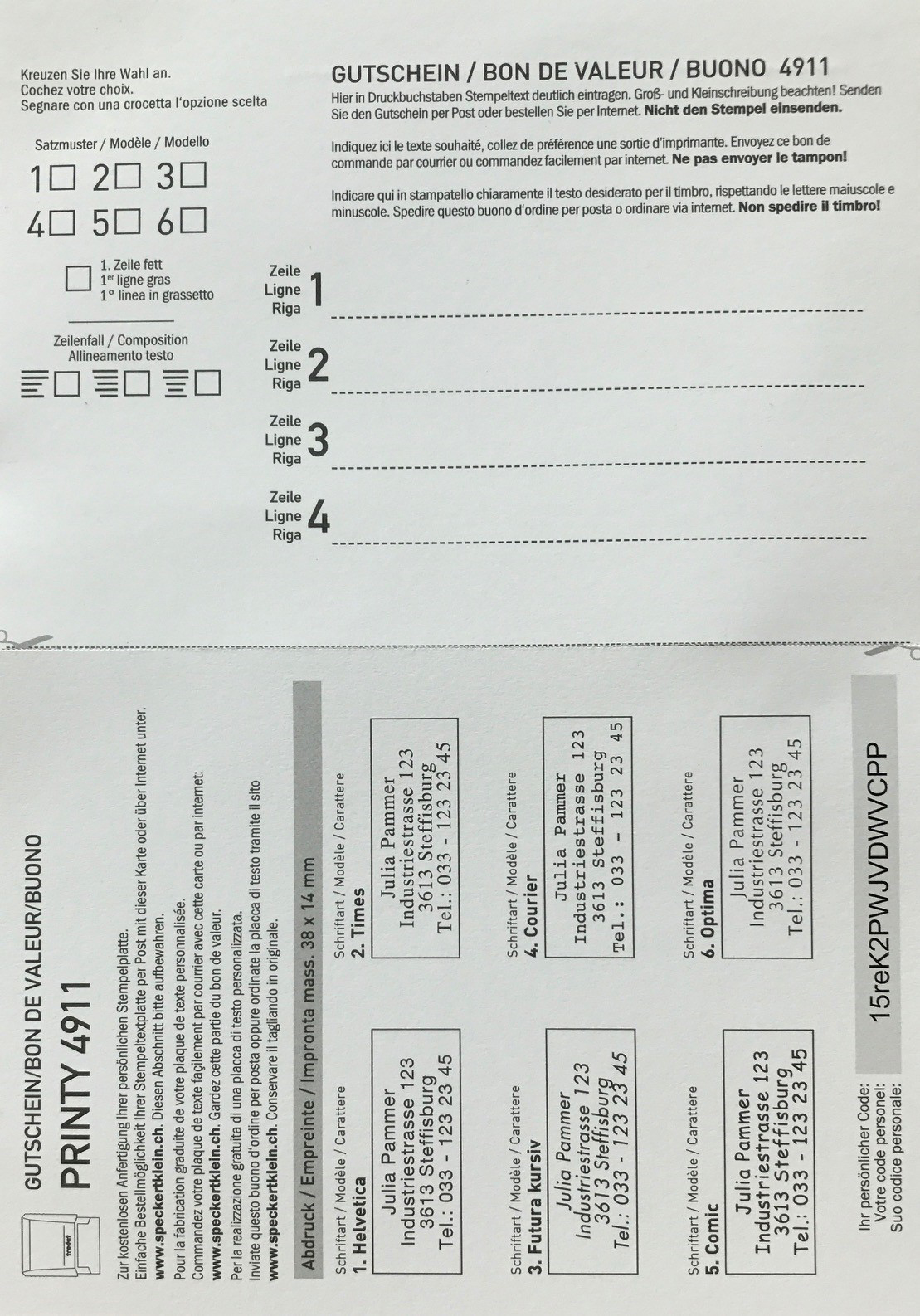 Ersatzgutscheine für das Stempelmodell PRINTY 4911. Der Original PRINTY ist klimaneutral und einer der kleinsten und leichtesten Selbstfärbestempel der Welt. Zwei spezielle Griffzonen erlauben einen Kissenwechsel ohne Berühren des Farbspeichers - für garantiert saubere Finger. Das glasklare Panoramasichtfenster ermöglicht einen exakt platzierten Abdruck, die transparenten Bodenkanten erlauben präzises Ausrichten am Dokument.