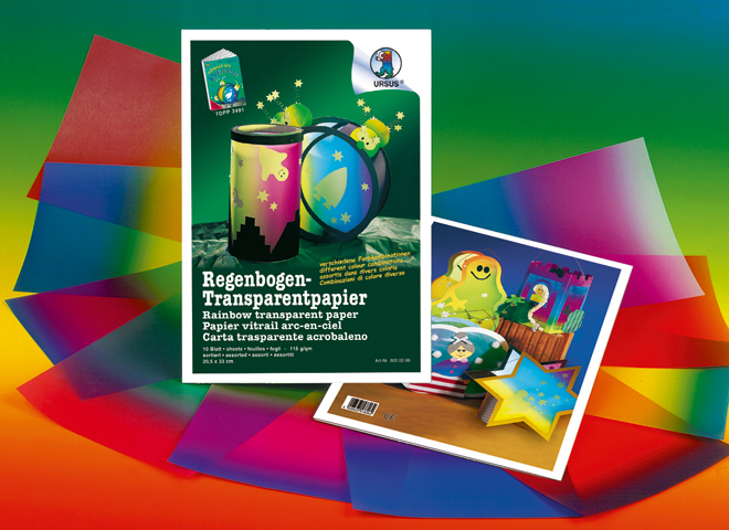 Das Transparentpapier von URSUS hat verschiedenste Regenbogen-Färbungen und ermöglicht Ihnen ein farbenfrohes Basteln.