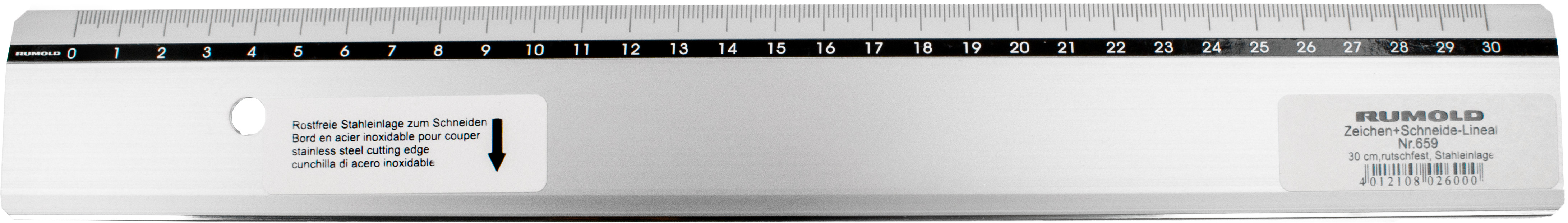 Präzisions-Zeichen- und Schneidelineal aus eloxiertem Aluminium, mit Tuschefacette und Aufhängeloch, rutschfest, augenschonende weisse Bezifferung auf schwarzem Band, Präzisions-mm-Skala auf Alu-Facette, rostfreie Stahleinlage für Schneidearbeiten.