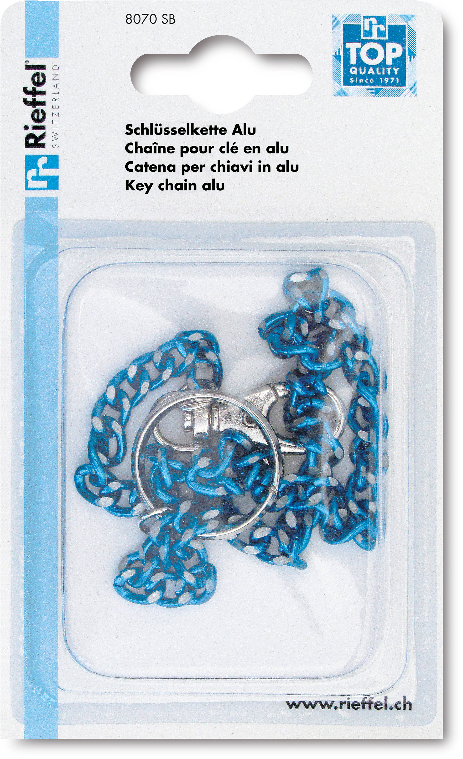 Aus farbigem Alu hergestellte Schlüsselkette, ausgestattet mit einem Karabinerhaken und einem Schlüsselring.