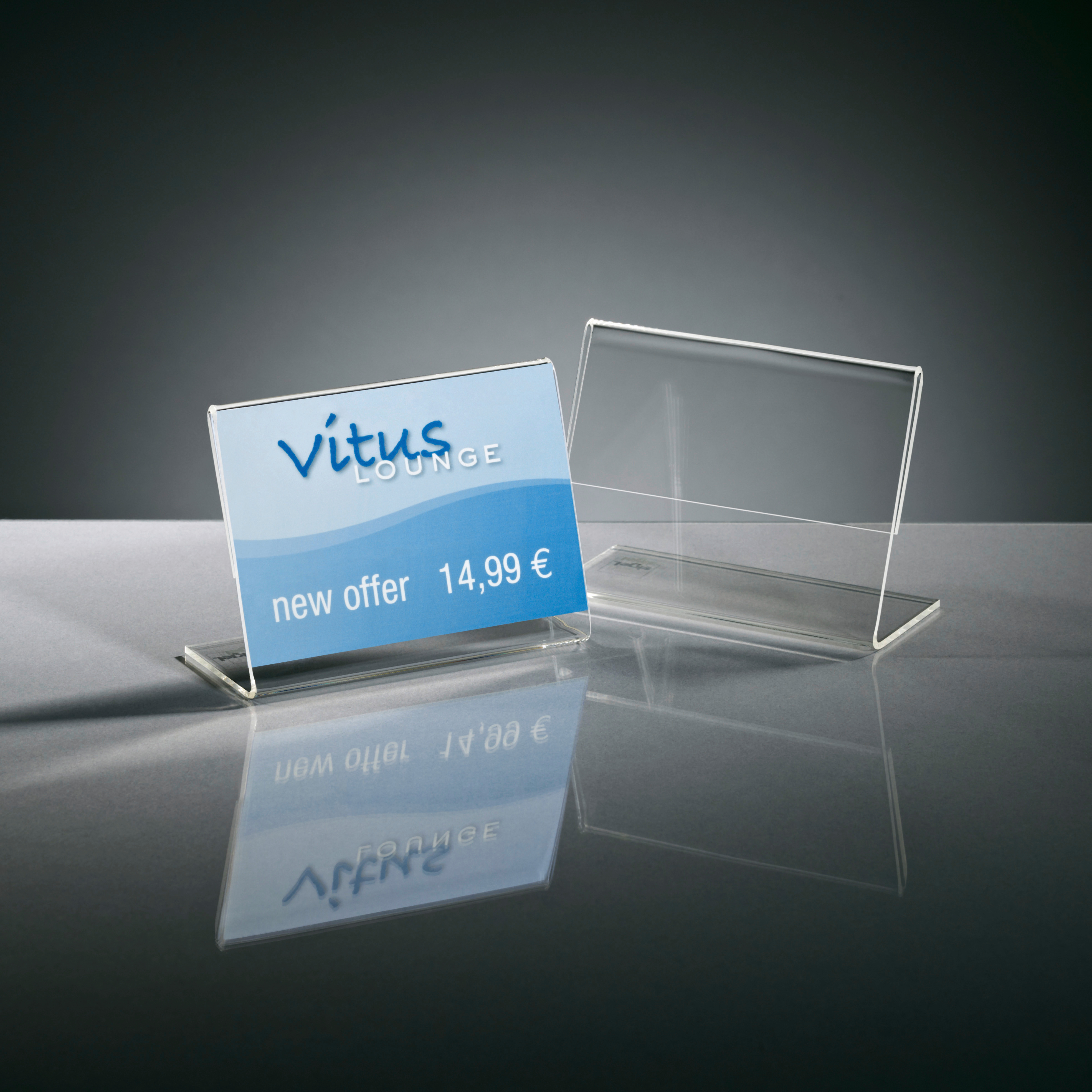Vielseitig einsetzbarer, schräger Info-/Preisaufsteller zur einseitigen Präsentation. Geeignet für Einsteckschilder / Informationen in verschiedenen Formaten. Der Aufsteller besteht aus qualitativ hochwertigem, glasklarem, 2,0 mm starkem Acryl. Dies sorgt für hohe Stabilität und Standfestigkeit.