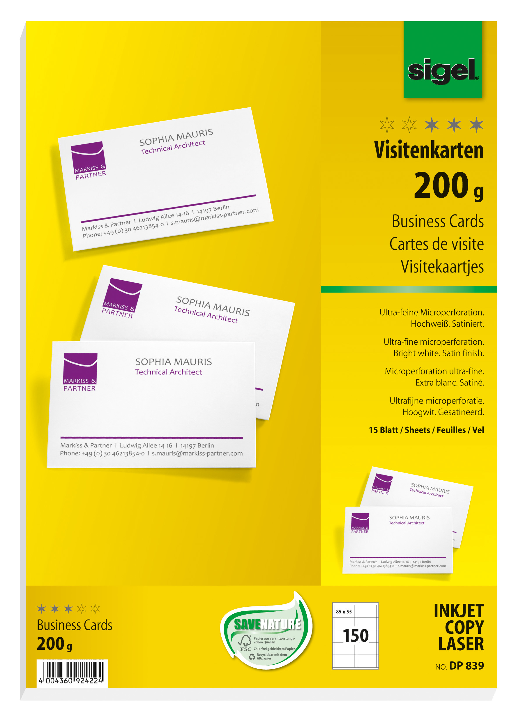 PC-Visitenkarten hochweiss sind ideal zum schnellen und einfachen Gestalten und Drucken am eigenen PC und Drucker. Die ultra-feine Microperforation garantiert ein leichtes Abtrennen und exakte Kanten fast wie geschnitten. Die Visitenkarten sind vielseitig einsetzbar beispielsweise für Events, Messen oder geschäftlichen und privaten Kontaktaustausch. Für alle InkJet- und (Farb-)Laser-Drucker sowie Kopierer geeignet.
