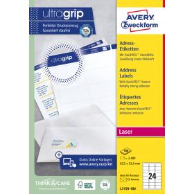 Qualität vom Etiketten-Experten: die weissen Adress-Etiketten L7159-100 für Laser-Drucker im Format 63,5 x 33,9 mm von Avery Zweckform eignen sich z.B. zum Adressieren von C6 Kuverts. 2.400 Adress-Etiketten pro Packung auf 100 Bogen. ultragrip® macht ultra-effizient: die innovative ultragrip®-Technologie mit dem spürbaren Profil auf dem Etikettenbogen gewährleistet einen ultra-präzisen und absolut staufreien Druckerdurchlauf. Geeignet für alle Laser-Drucker. Regelmässig überprüft und für Laser bestätigt durch TÜV Süd. Ideal auch für Seriendruck und grössere Druckaufträge. Die Etiketten lassen sich durch die zusätzliche QuickPEEL-Abziehhilfe besonders einfach und schnell vom Bogen abziehen und aufkleben. So arbeiten Sie effizient wie stressfrei und schaffen sich wertvolle Zeit für die wirklich wichtigen Dinge. Ideen drucken – einfach & professionell: mit Etiketten von Avery Zweckform können Sie den kostenlosen Online Etiketten-Designer unter www.avery.eu/print nutzen. Gestalten Sie Ihr Etikett mit der Software komplett selbst, verwenden Sie eine der Design-Vorlagen zu zahlreichen Themen, die Sie individuell anpassen können oder laden Sie Ihr fertiges Design hoch und drucken anschliessend standgenau aus. So schnell und einfach sorgen Sie für einen professionellen Auftritt. Think & Care - Avery Zweckform ist seit 2020 klimaneutral: die Treibhausgasemissionen des Standortes werden durch zertifizierte Klimaschutzprojekte ausgeglichen. Schon seit 2014 wird ausschliesslich Ökostrom/-gas verwendet. Forschung, Entwicklung, Produktion, Logistik und Verwaltung am Firmenstandort in Oberlaindern/Bayern garantieren höchste Qualitäts- und Umweltstandards sowie kurze Lieferwege. Das Obermaterial dieser chlorfrei gebleichten Etiketten wird zu 100% aus FSC®-zertifiziertem Papier aus verantwortungsvoll bewirtschafteten Wäldern hergestellt.