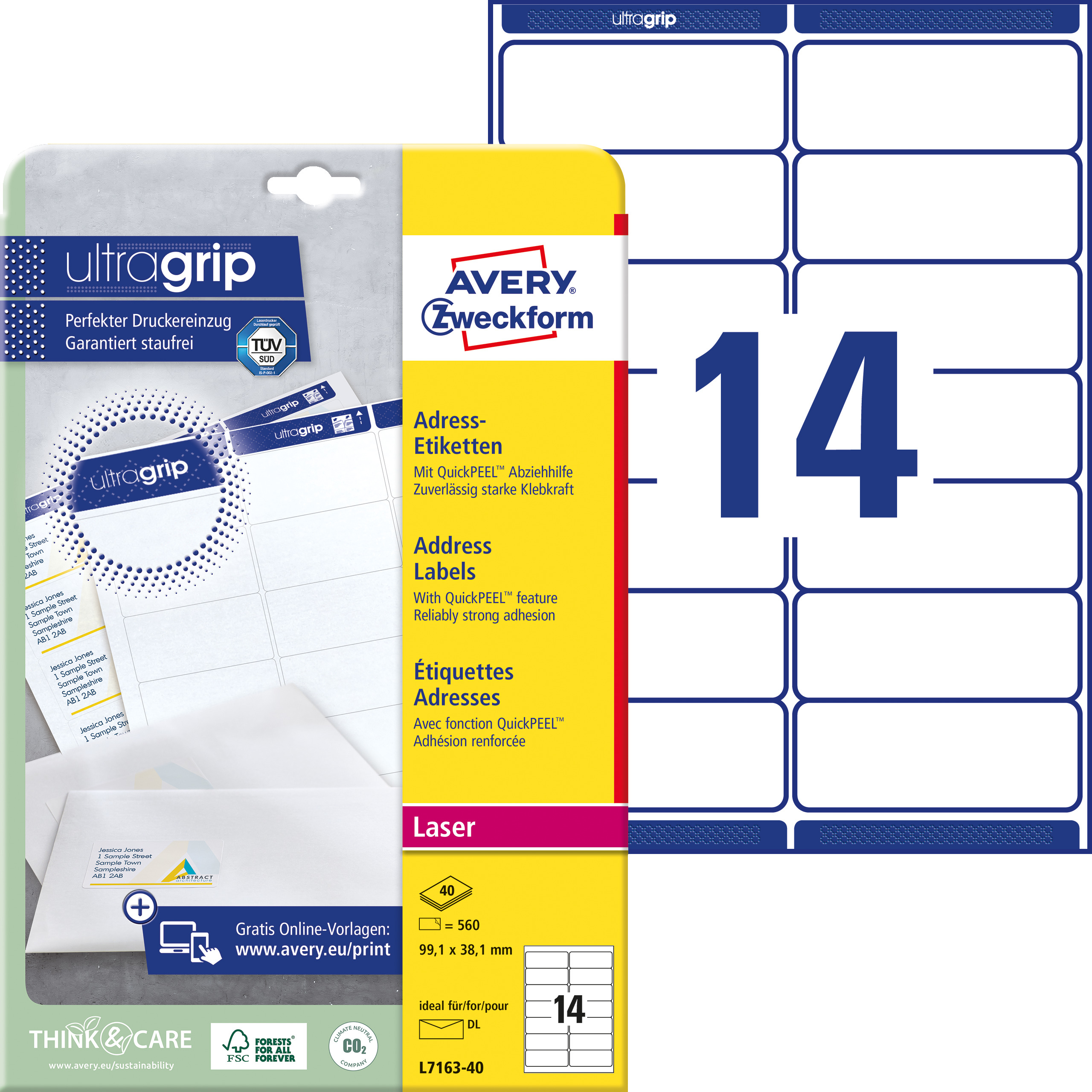 Qualität vom Etiketten-Experten: die weissen Adress-Etiketten L7163-40 für Laser-Drucker im Format 99,1 x 38,1 mm von Avery Zweckform eignen sich z.B. zum Adressieren von DIN lang Kuverts. 560 Adress-Etiketten pro Packung auf 40 Bogen. ultragrip® macht ultra-effizient: die innovative ultragrip®-Technologie mit dem spürbaren Profil auf dem Etikettenbogen gewährleistet einen ultra-präzisen und absolut staufreien Druckerdurchlauf. Geeignet für alle Laser-Drucker. Regelmässig überprüft und für Laser bestätigt durch TÜV Süd. Ideal auch für Seriendruck und grössere Druckaufträge. Die Etiketten lassen sich durch die zusätzliche QuickPEEL-Abziehhilfe besonders einfach und schnell vom Bogen abziehen und aufkleben. So arbeiten Sie effizient wie stressfrei und schaffen sich wertvolle Zeit für die wirklich wichtigen Dinge. Ideen drucken – einfach & professionell: mit Etiketten von Avery Zweckform können Sie den kostenlosen Online Etiketten-Designer unter www.avery.eu/print nutzen. Gestalten Sie Ihr Etikett mit der Software komplett selbst, verwenden Sie eine der Design-Vorlagen zu zahlreichen Themen, die Sie individuell anpassen können oder laden Sie Ihr fertiges Design hoch und drucken anschliessend standgenau aus. So schnell und einfach sorgen Sie für einen professionellen Auftritt. Think & Care - Avery Zweckform ist seit 2020 klimaneutral: die Treibhausgasemissionen des Standortes werden durch zertifizierte Klimaschutzprojekte ausgeglichen. Schon seit 2014 wird ausschliesslich Ökostrom/-gas verwendet. Forschung, Entwicklung, Produktion, Logistik und Verwaltung am Firmenstandort in Oberlaindern/Bayern garantieren höchste Qualitäts- und Umweltstandards sowie kurze Lieferwege. Das Obermaterial dieser chlorfrei gebleichten Etiketten wird zu 100% aus FSC®-zertifiziertem Papier aus verantwortungsvoll bewirtschafteten Wäldern hergestellt.