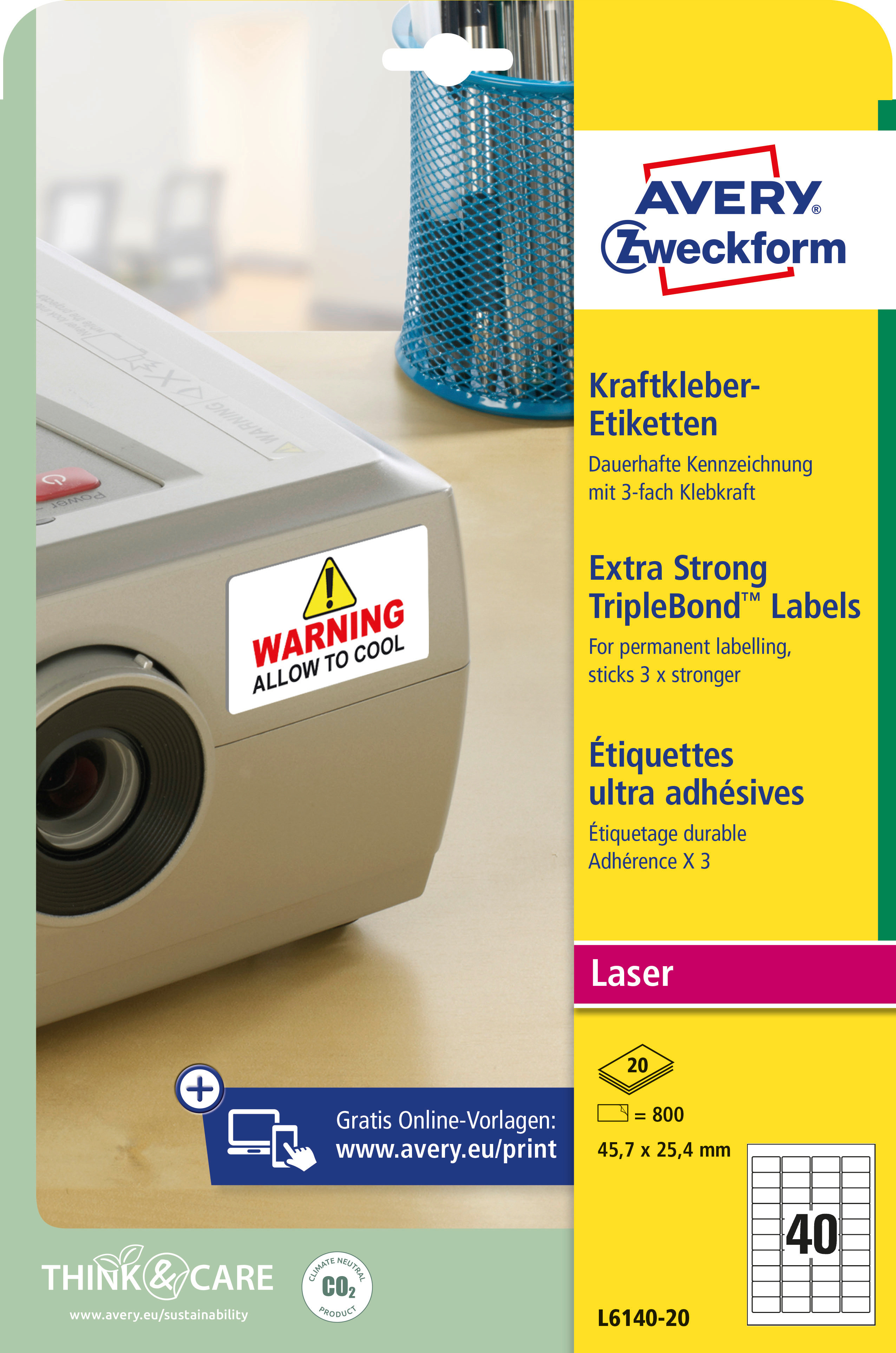Qualität vom Etiketten-Experten: die weissen, strapazierfähigen Kraftkleber-Etiketten L6140-20 für Laser-Drucker im Format 45,7 x 25,4 mm von Avery Zweckform sind ideal zur permanenten Produkt- und Eigentumskennzeichnung. 800 wasserfeste Aufkleber aus Polyester-Folie auf 20 Bogen. Die Folien-Etiketten kleben dreimal stärker als herkömmliche Etiketten und sind selbst für schwierige Oberflächen wie z.B. heissen, kalten oder rauen Untergrund kein Problem. Die Folien-Aufkleber sind auch besonders strapazierfähig: reiss- und wasserfest, öl-, schmutz-, UV- und temperaturbeständig (-40° bis + 100°C), auch für den Aussenbereich geeignet. Geeignet für alle gängigen Laser-Drucker. Ideen drucken - einfach & professionell: mit Etiketten von Avery Zweckform können Sie den kostenlosen Online Etiketten-Designer unter www.avery.eu/print nutzen. Gestalten Sie Ihr Etikett mit der Software komplett selbst, verwenden Sie eine der Design-Vorlagen zu zahlreichen Themen, die Sie individuell anpassen können oder laden Sie Ihr fertiges Design hoch und drucken anschliessend standgenau aus. So schnell und einfach sorgen Sie für einen professionellen Auftritt. Think & Care - Avery Zweckform ist seit 2020 klimaneutral: die Treibhausgasemissionen des Standortes werden durch zertifizierte Klimaschutzprojekte ausgeglichen. Schon seit 2014 wird ausschliesslich Ökostrom/-gas verwendet. Forschung, Entwicklung, Produktion, Logistik und Verwaltung am Firmenstandort in Oberlaindern/Bayern garantieren höchste Qualitäts- und Umweltstandards sowie kurze Lieferwege. Die Etiketten aus PVC-freier Folie werden klimaneutral hergestellt, die Emissionen des Materials werden kompensiert.
