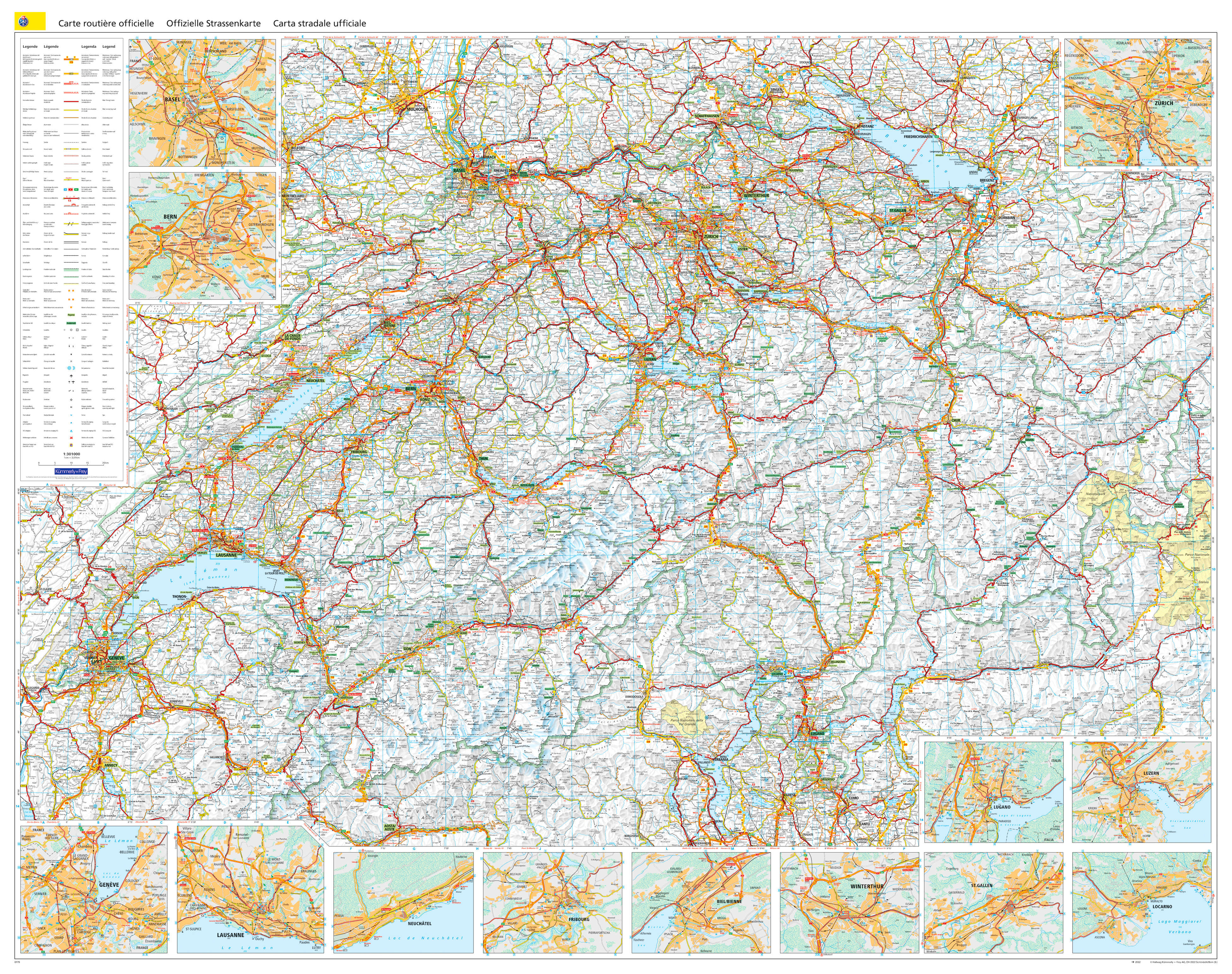 Das Poster für Ihr Büro oder Zuhause. Die Schweizer Strassenkarte in einem Massstab von 1:301'000 ist zusätzlich ausgestattet mit Ortsindexen und Transitplänen.