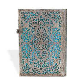 Der Ausdruck Filigran enthält die lateinischen Wörter "filum" (Faden) und "granum" (Korn) und bezeichnet eine Kunstform, die darin besteht, ein Grunddesign aus Silberbogen zu stanzen und dann feingliedrige Muster hineinzugravieren. Der polierte Einband des Paperblanks Notizbuchs Silberfiligran Maya Blau wurde von der französischen Ausgabe von Johann Arndts Paradies-Gärtlein aus dem Jahr 1697 inspiriert.