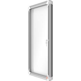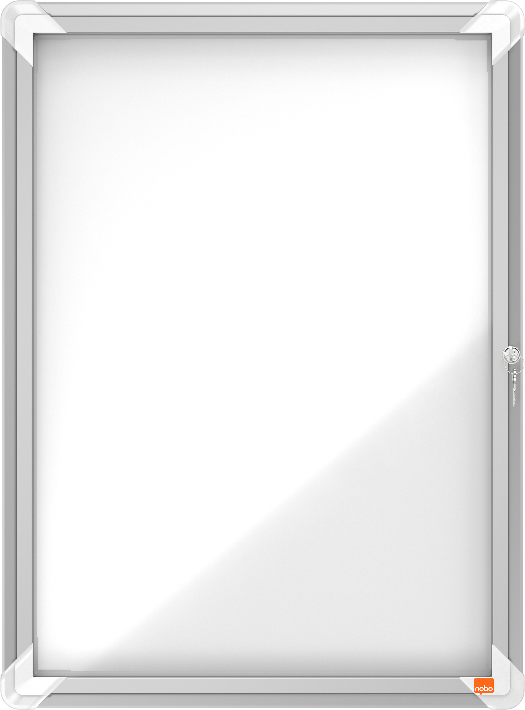 Wetterfester Schaukasten für den Aussenbereich mit magnetischer Rückwand, Klapptür aus 4-mm-Sicherheitsglas und Sicherheitsschloss. Der Schaukasten wird von einem modernen Aluminiumrahmen eingefasst und mittels der mitgelieferten Wandbefestigung angebracht. Die weisse, magnetische Metalloberfläche ist trocken abwischbar und eignet sich bestens zum Anheften und Präsentieren von Dokumenten.