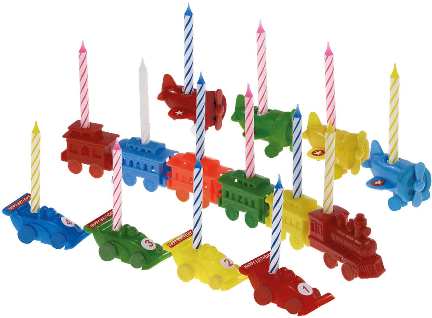 Kerzenset mit Halter in Form von Auto, Flugzeug und Zug. Ideal für das Geburtstagsfest.