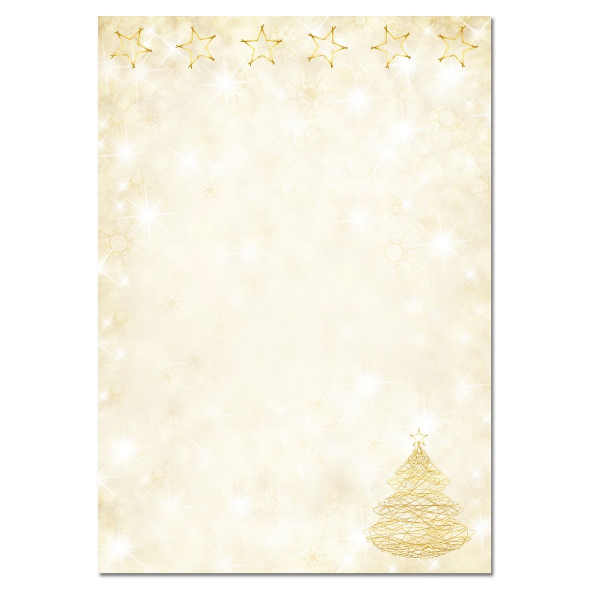 Weihnachts-Motiv-Papier mit goldener Heissfolienprägung. 90g-Feinpapier mit einem Weihnachsbaum und Sternen als Motiv, zum Bedrucken mit InkJet- und Laser-Drucker sowie zum Kopieren geeignet.