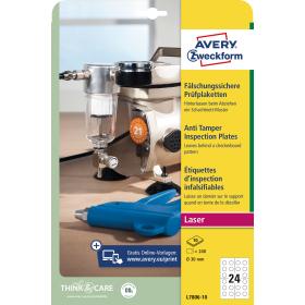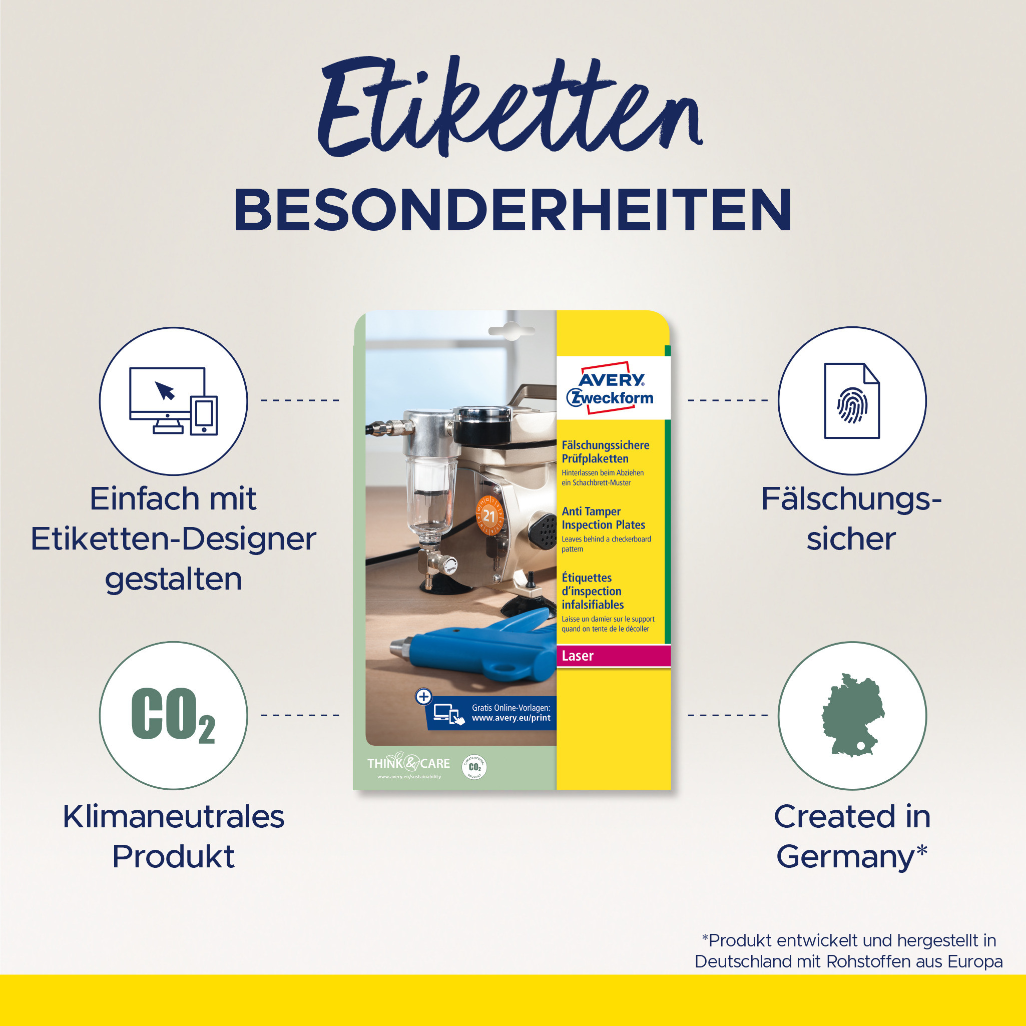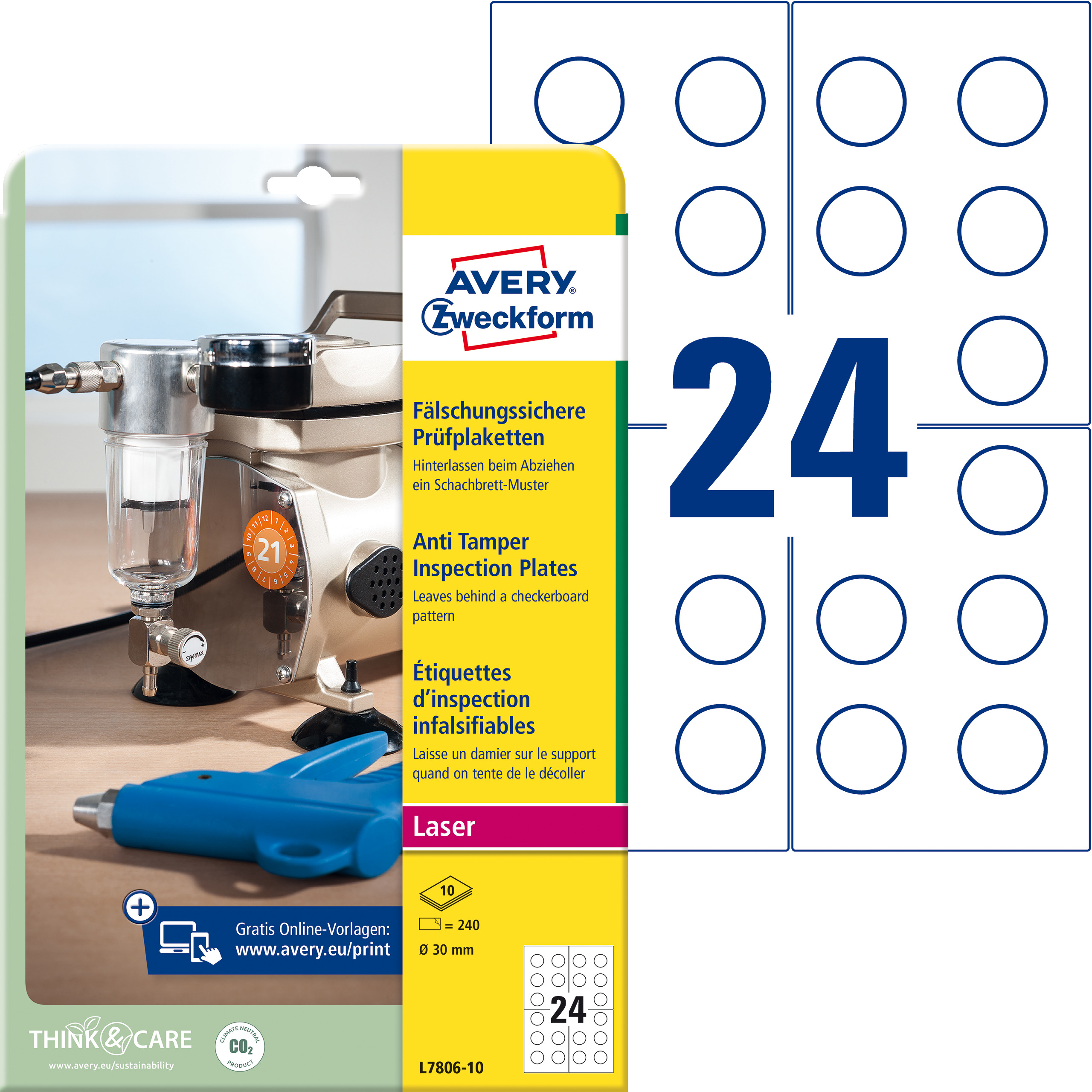 Qualität vom Etiketten-Experten: die fälschungssicheren Prüfplaketten L7806-10 im runden, Ø 30 mm Format von Avery Zweckform sind besonders manipulationssicher und widerstandsfähig. 240 Prüfplaketten auf 10 Bogen. Die Etiketten lassen sich nur noch in kleinen Einzelteilen abziehen, was eine Übertragung der Prüfplakette unmöglich macht. Sie beugen damit Manipulation und Missbrauch aktiv vor. Die Etiketten sind ideal zur Prüfkennzeichnung Ihres Inventars und Eigentums, wie z.B. Drucker, Kaffeemaschinen, Büromöbel etc. Die Plaketten haften auf vielen verschiedenen Oberflächen und sind resistent gegen Wasser, Öl, Reinigungs-, Desinfektions- und Lösemittel und temperaturbeständig von -40°C bis +100°C. Geeignet für alle gängigen Laser-Drucker. Ideen drucken - einfach & professionell: mit Etiketten von Avery Zweckform können Sie den kostenlosen Online Etiketten-Designer unter www.avery.eu/print nutzen. Gestalten Sie Ihr Etikett mit der Software komplett selbst, verwenden Sie eine der Design-Vorlagen zu zahlreichen Themen, die Sie individuell anpassen können oder laden Sie Ihr fertiges Design hoch und drucken anschliessend standgenau aus. So schnell und einfach sorgen Sie für einen professionellen Auftritt. Think & Care - Avery Zweckform ist seit 2020 klimaneutral: die Treibhausgasemissionen des Standortes werden durch zertifizierte Klimaschutzprojekte ausgeglichen. Schon seit 2014 wird ausschliesslich Ökostrom/-gas verwendet. Forschung, Entwicklung, Produktion, Logistik und Verwaltung am Firmenstandort in Oberlaindern/Bayern garantieren höchste Qualitäts- und Umweltstandards sowie kurze Lieferwege. Die Etiketten aus PVC-freier Folie werden klimaneutral hergestellt, die Emissionen des Materials werden kompensiert.