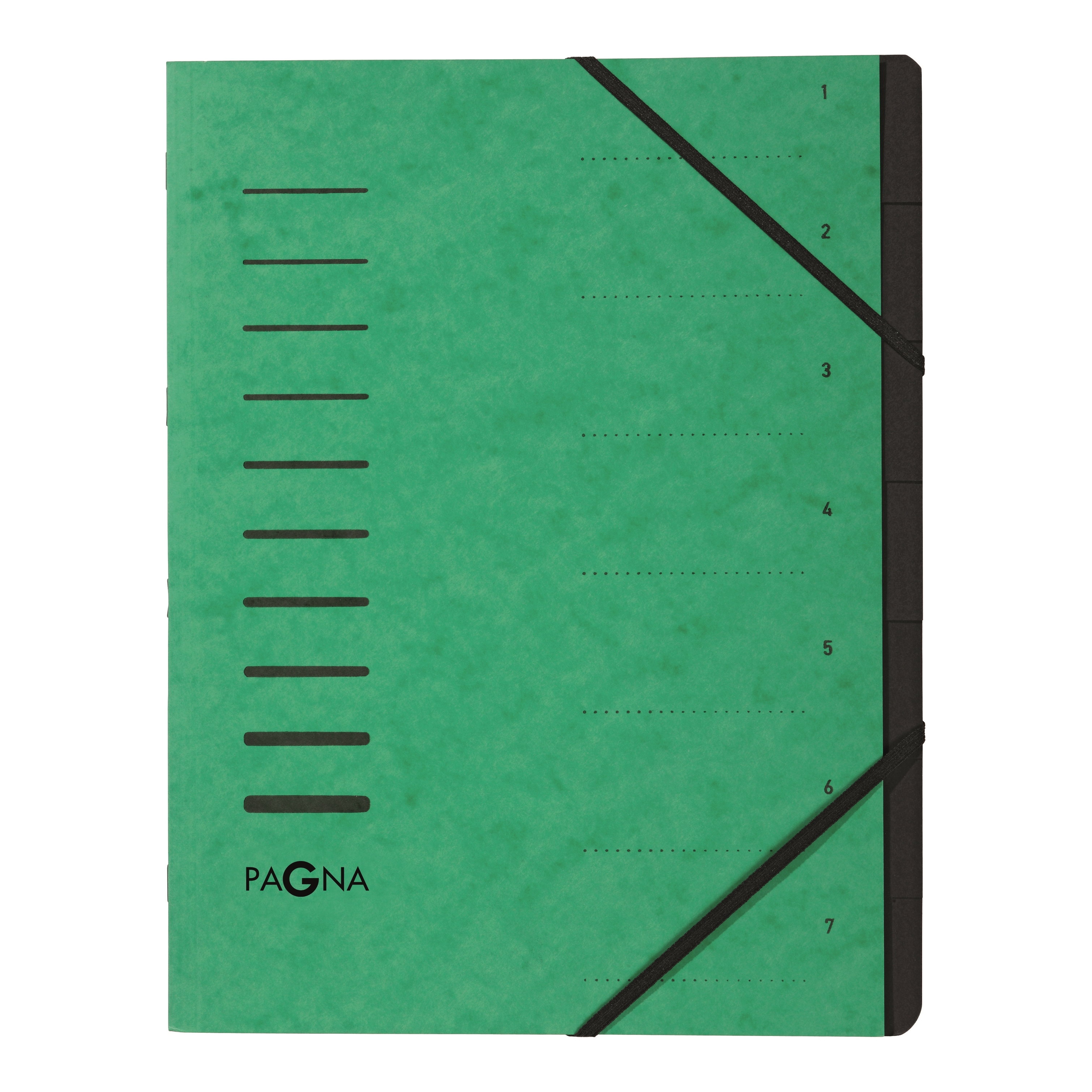 Ordnungsmappe, für Dokumente im Format A4, 7 Fächer, grün, aus strapazierfähigem Pressspan, mit schwarzem Eckspanngummi, 2 Schaulöchern im Buchblock, schwarzem Griffregister aus stabilem Karton für schnellen Zugriff auf Unterlagen, Aufdruck 1-7 auf dem Deckel, individuell beschriftbar