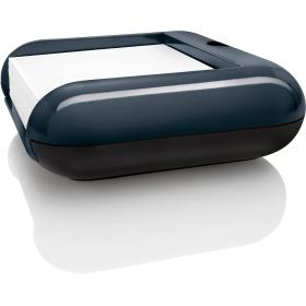 Hochglänzende Haftnotizbox eyestyle® in puristischem Design. Inklusive integriertem Stiftehalter. Gefertigt aus einer Materialkombination aus Acryl und schwarzem ABS-Kunststoff.