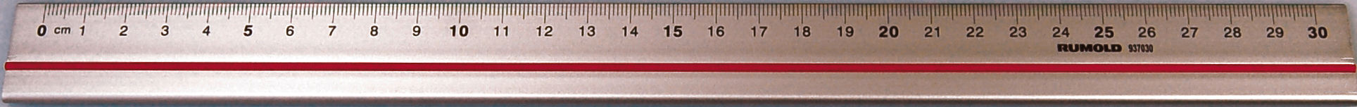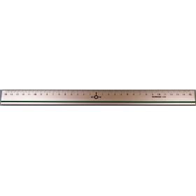 Handliches Schul- und Bürolineal aus Aluminium mit metrischer Teilung auf Vorderseite, beginnend mit dem Null-Punkt; und metrischer Teilung mit dem Null-Punkt in der Mitte auf der Rückseite. Rutschhemmend auf beiden Seiten durch Gummilippen in trendigen