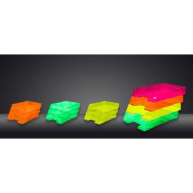 Die leuchtenden Neon-Farben von STYROFILE setzen leuchtende Akzente in jedem Büro. In den senkrecht und versetzt stapelbaren Briefablagen finden Formate bis C4 Platz.