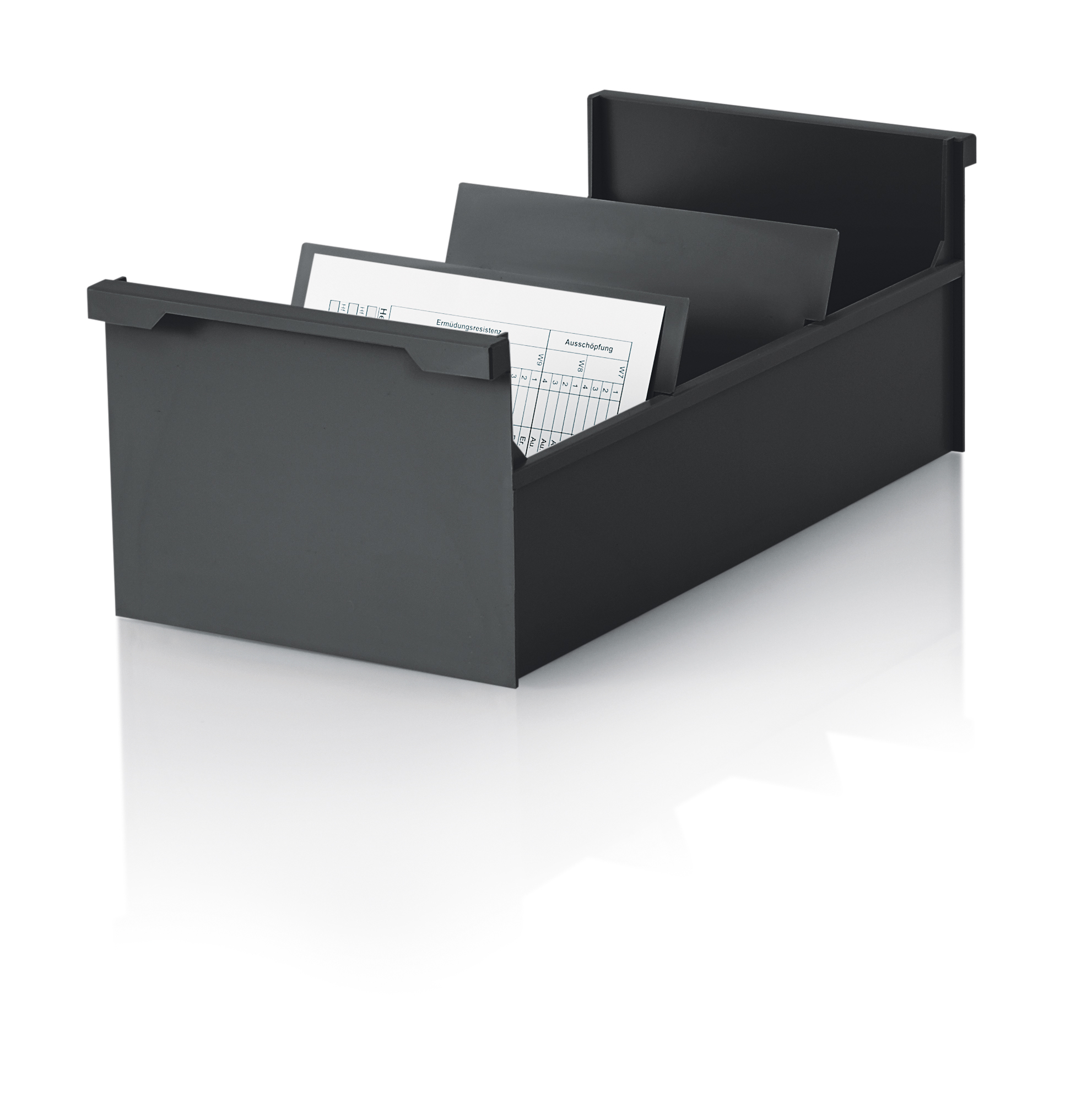 Auch im Computer-Zeitalter funktioniert das Leben nicht ohne Papier. Für die Ablage von Kartei- oder anderen Karten führt styro Karteikästen in den verschiedensten Formaten. Zur Unterteilung liegen 2 Schwenkplatten bei, die für eine feinere Sortierung paarweise ergänzt werden können. styro-Karteikästen können in Hängeregistraturkörben eingehängt werden.