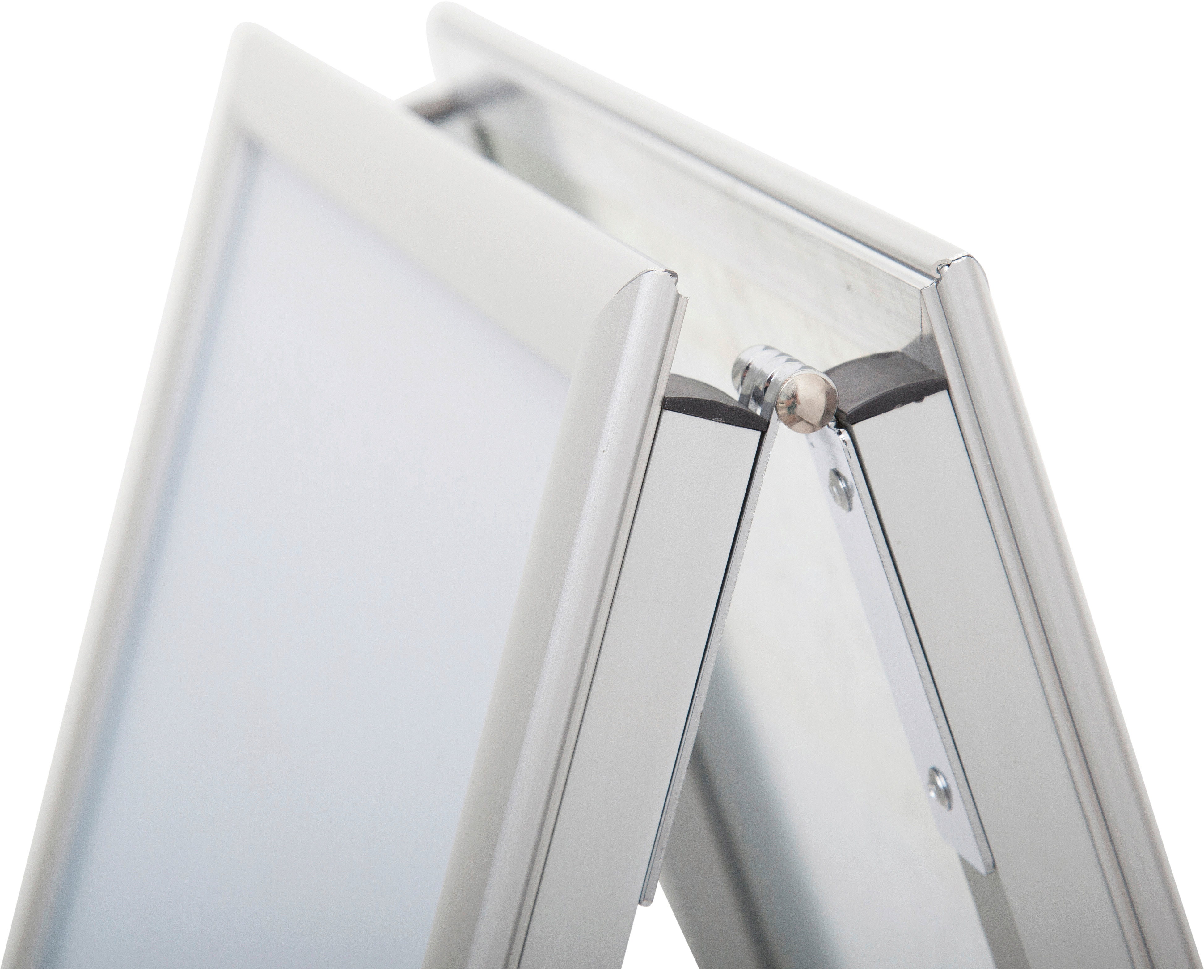 Doppelseitiger, wetterbeständiger Kundenstopper, ideal für die professionelle Präsentation von Informationen, Plakaten, Postern im Innen- und Aussenbereich. Einfaches Wechseln bzw. Einlegen des Inhalts von vorne: Klapprahmen aufklappen, Schutzfolie entnehmen, Inhalt und Schutzfolie einlegen, Klapprahmen zuklappen - fertig. Die UV-stabilisierte Anti-Reflexionsfolie schützt den Inhalt vor dem Ausbleichen. Der Rahmen ist aus silbereloxiertem Aluminiumprofil (32 mm). Die Rückwände sind aus rostfreiem, feuerverzinktem Metall und sorgen durch ihr Gewicht für eine hohe Standfestigkeit.