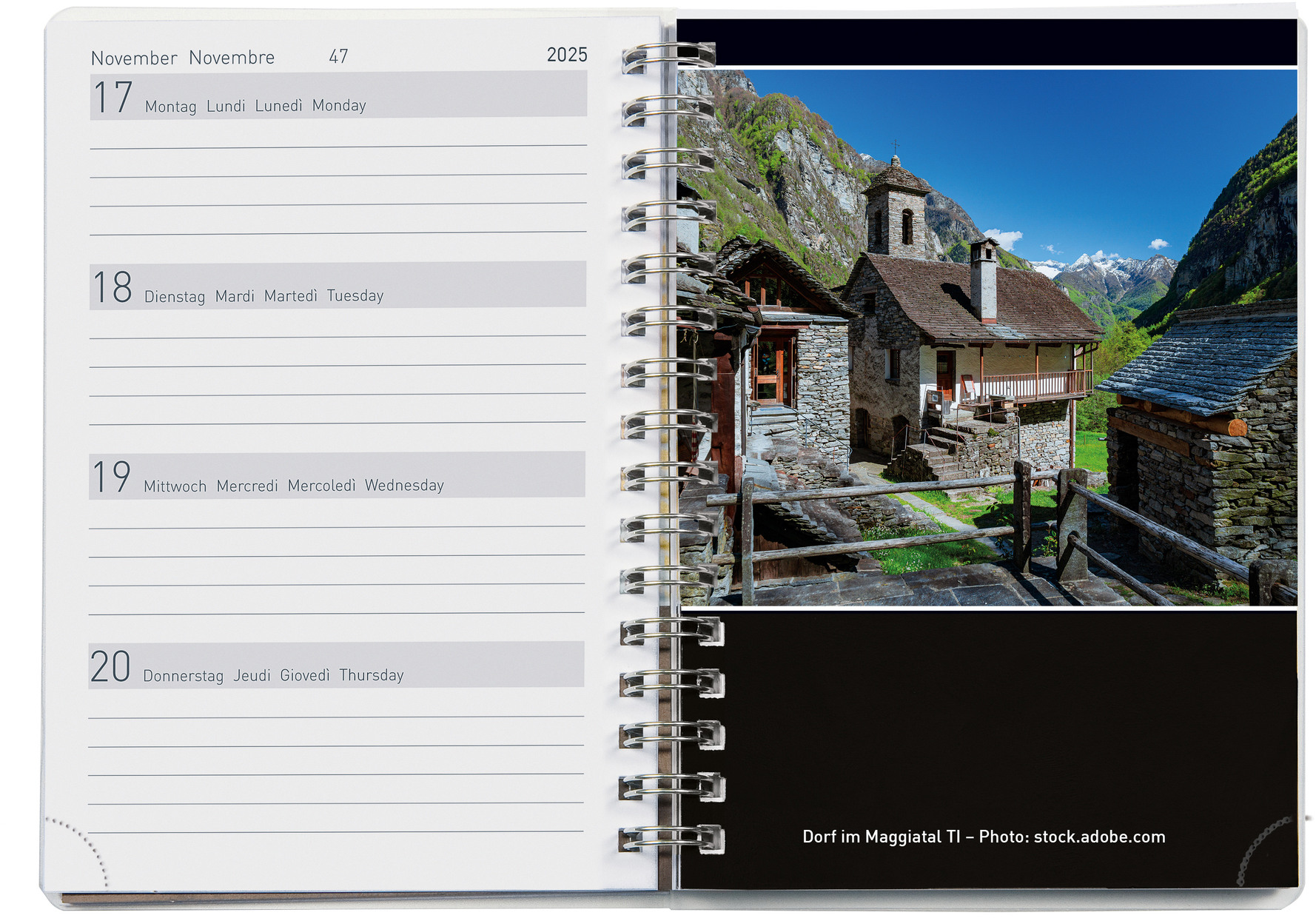 Die Biella Taschenagenda mit Bildern bietet Ihnen die Kombination zwischen Bildkalender und Taschenagenda. Die total vier verschiedenen Themenbereiche und die jeweils 14 Bilder lassen Ihre Terminplanung zu einem Ereignis werden. Die Taschenagenda mit 3 ½ Tage pro Woche bietet Ihnen ausserdem genügend Platz für Termine und Notizen.