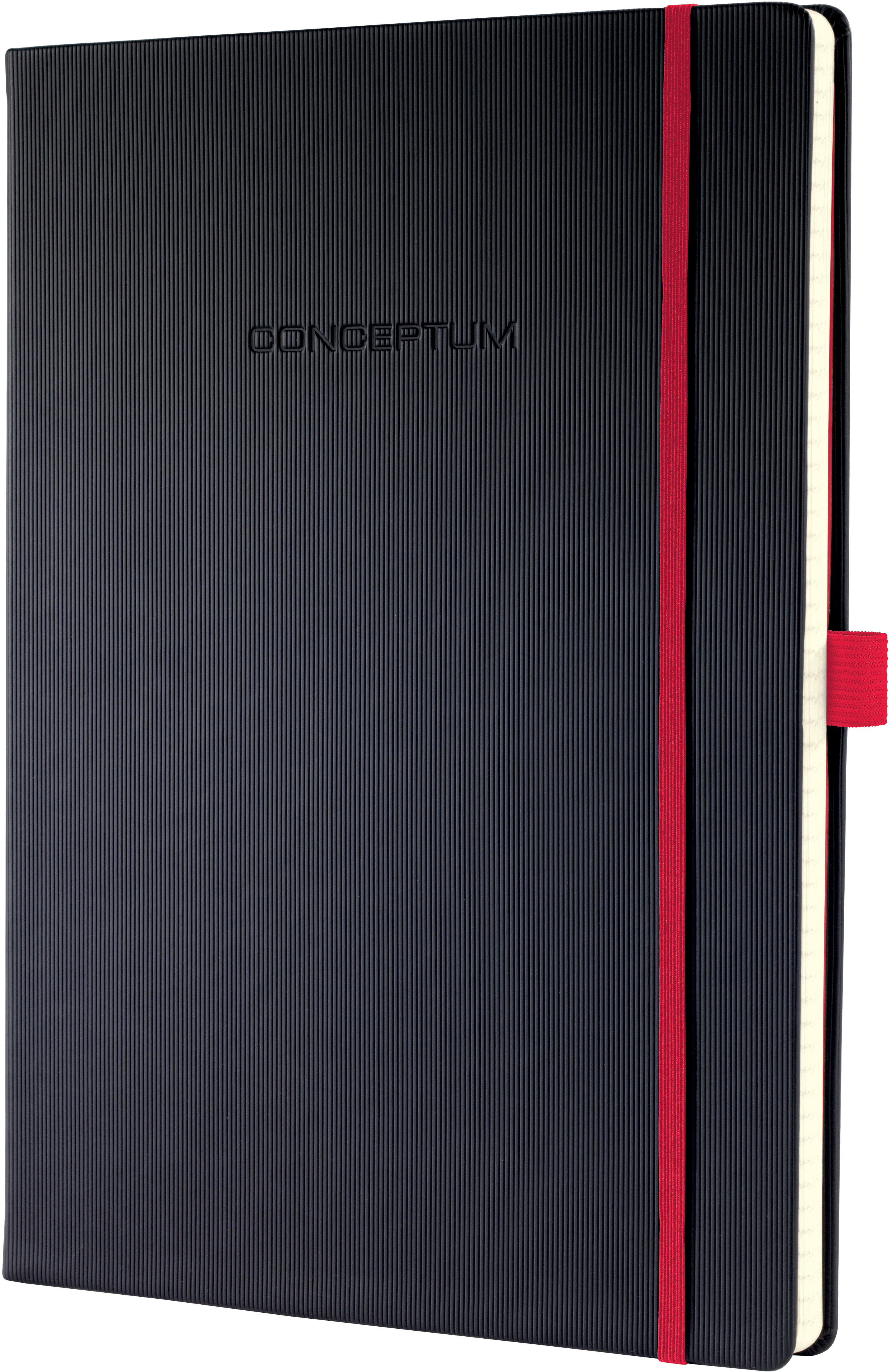 Notizbuch Conceptum mit roten Akzenten. Hardcover-Einband mit geriffelter Kunststoff-Oberfläche. Zu den Besonderheiten zählen Stiftschlaufe und Gummibandverschluss in kontrastreichem Rot sowie Inhaltsverzeichnis, Quickpocket, Archivtasche mit 2 Kartenfächern für je bis zu 10 Visitenkarten, 2 Zeichenbänder und Titel- und Rückenetiketten. PEFC zertifiziert.