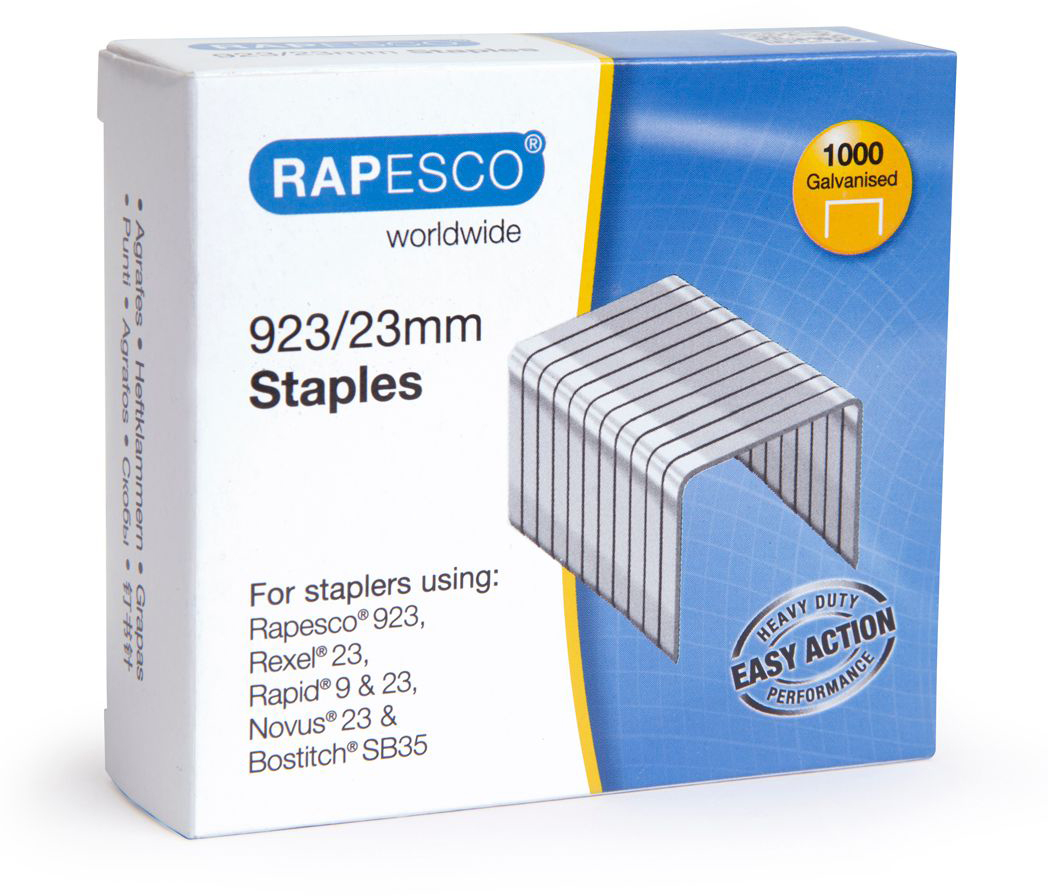Hochqualitative 23mm verzinkte Heftklammern für Rapesco Extrastarke Heftgeräte, die Typ 923 Heftklammern benutzen. Auch kompatibel für den Gebrauch im Swingline Heavy Duty, Rapid Typ 9, Rexel Typ 23 und Typ 66 und Novus Typ 23 Heftgeräte. Passen auch in 5 Star und Q-Connect Heftgeräte. Packung mit 1.000 verzinkten Heftklammern mit einer Beinlänge von 23mm. Auch erhältlich in 6mm, 8mm, 10mm, 12mm, 15mm, 17mm und 20mm.