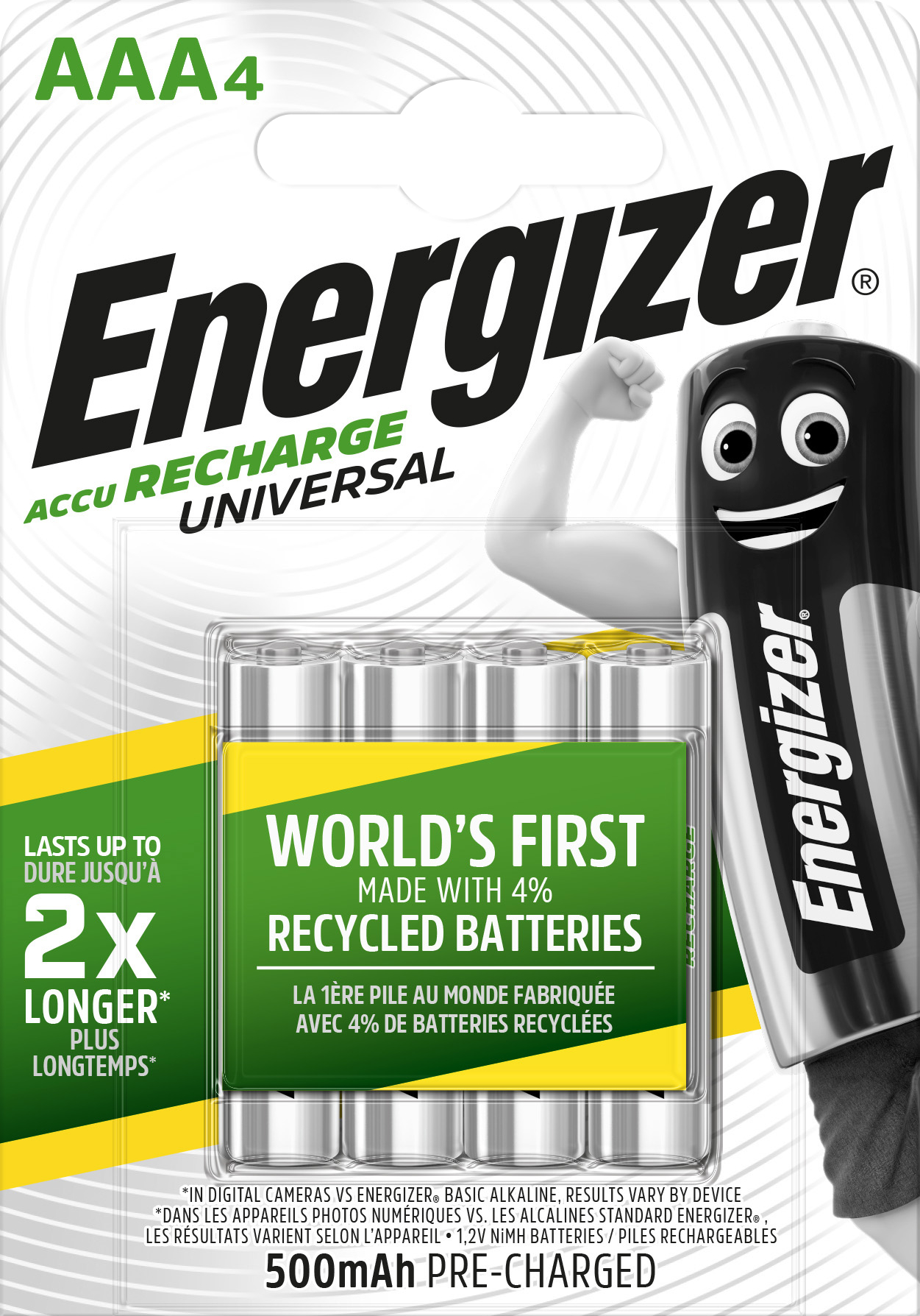 Recycling-Batterieinnovation jetzt auch für wiederaufladbare Batterien • bis zu 5 Jahre Gesamtnutzungsdauer bei herkömmlichem Nutzungsverhalten • für bis zu 1000 Aufladungen • erhalt der Energie für bis zu 12 Monate bei Lagerung • für alle Geräte und Anlässe • vorgeladen
