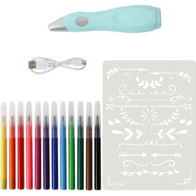 Stift hineindrehen und los geht’s! So kinderleicht ist die Bedienung dieses Air Brush. Die Farbe des Aquarellstiftes wird in der Luft zerstäubt wodurch sich im Nu effektvolle Bilder und Verläufe kreieren lassen – die Schablonen helfen dabei. Spass ist garantiert! Tipp: Experimentiere mit gefundenen Formen und Gegenständen und gestalte so einzigartige Motive.Inhalt:1x Elektrischer Airbrush Spray12x Aquarellstifte1x Motive auf Plastikschablone1x USB-Ladekabel1x Anleitung (D/F/I)