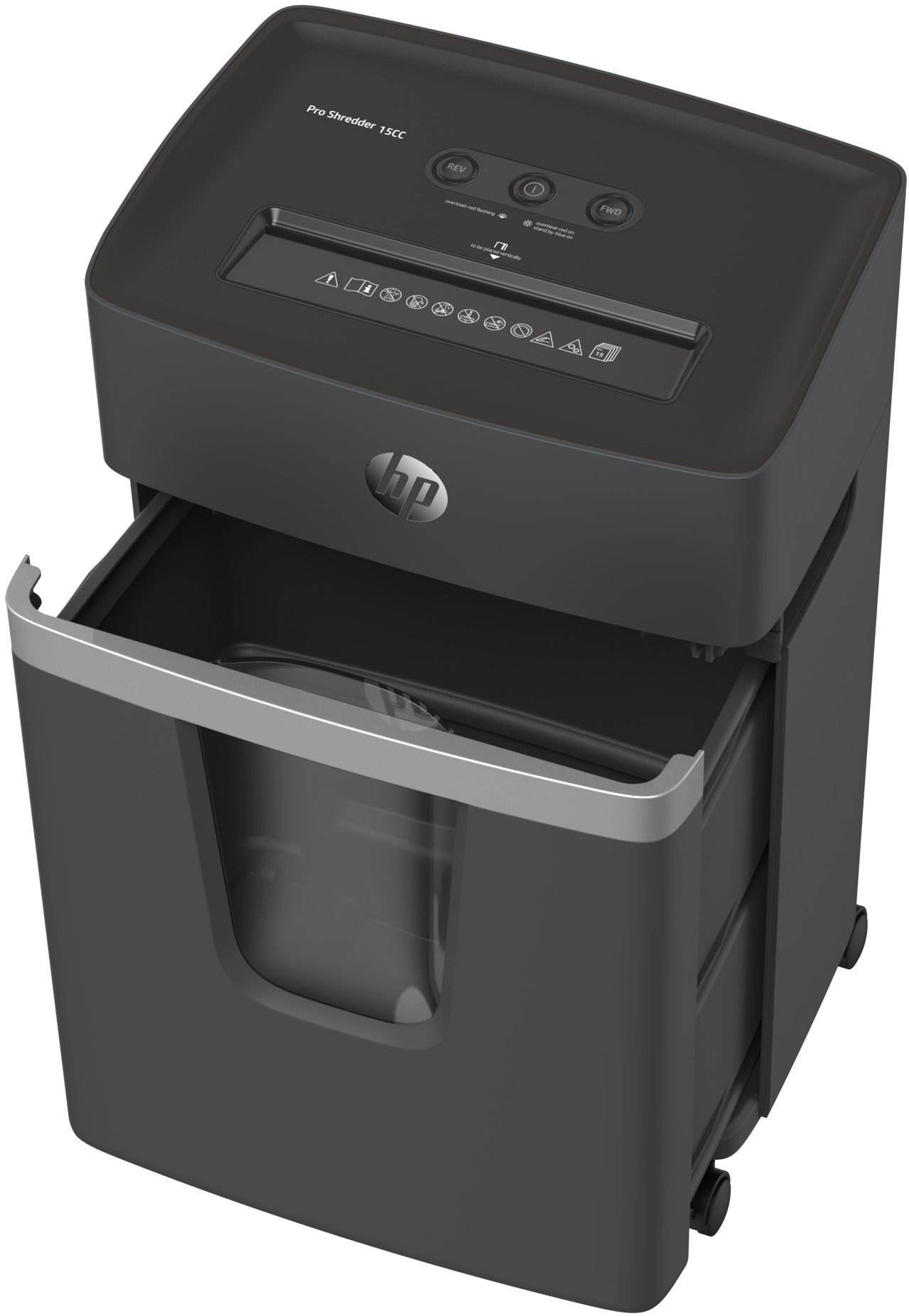 Der leise HP Aktenvernichter Pro 15CC mit Partikelschnitt ist bestens für Geschäfte und auch für den privaten Gebrauch geeignet.Er verfügt über die sehr hohe Sicherheitsstufe 4 (P-4) und vernichtet Heftklammern, Büroklammern, Kreditkarten und all Ihre vertraulichen Dokumente. Bis zu 15 Blatt können auf einmal in Partikel zerkleinert werden.Der HP Shredder Pro 15CC verfügt über eine Anti-Papierstau-Technologie und einen Überhitzungsschutz, so dass Sie sicher und effizient sensible Unternehmensdaten oder auch Bankunterlagen und andere Akten vernichten können.Der HP Aktenvernichter ist mit einem ausziehbaren 20 Liter Auffangbehälter ausgestattet, welcher mit geringem Aufwand entleert werden kann und verfügt über Rollen, welche das Umplatzieren des Schredders an einen anderen Arbeitsplatz erheblich vereinfachen.