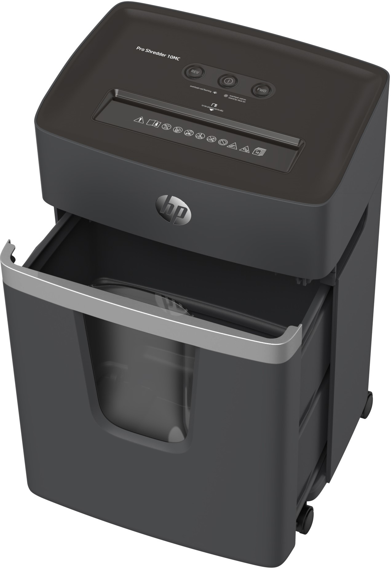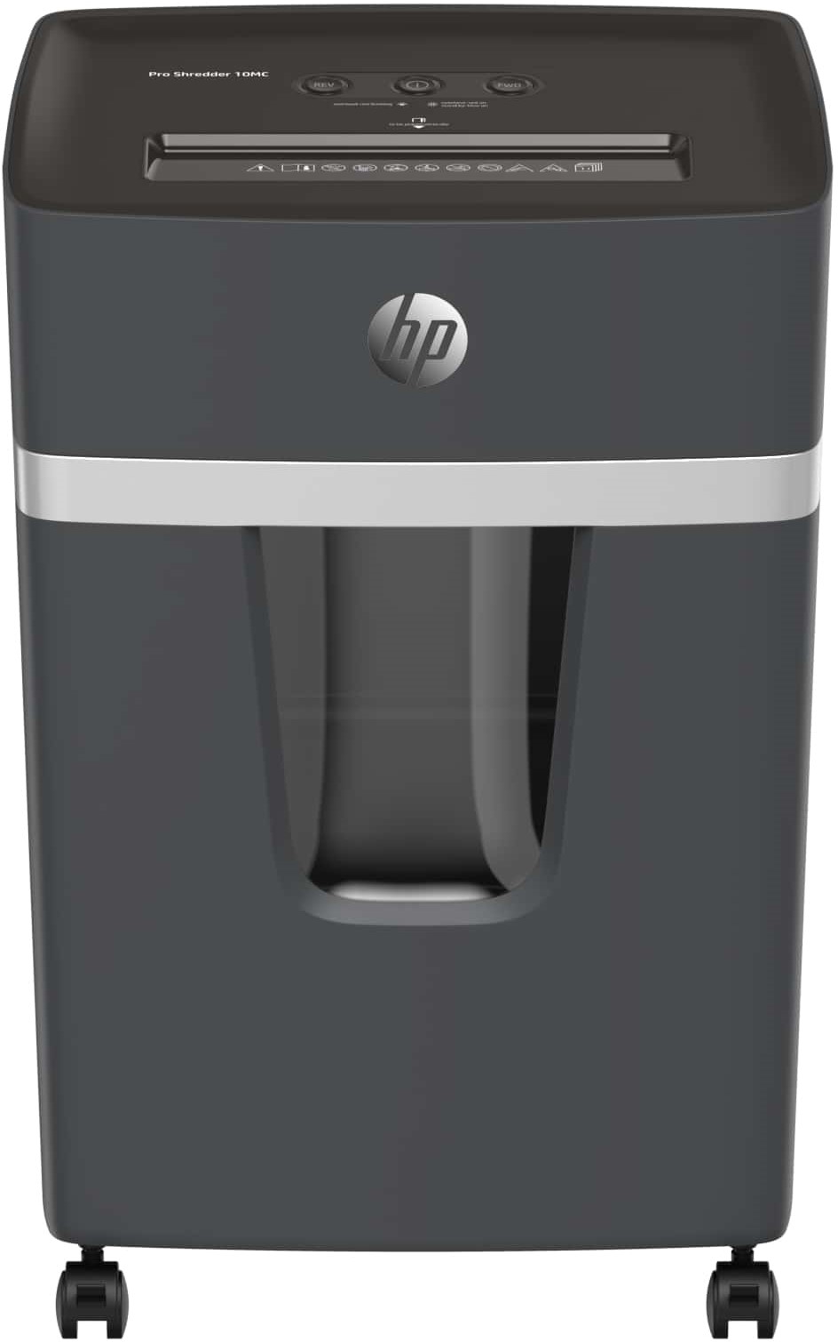 Der leise HP Aktenvernichter Pro 10MC überzeugt nicht nur durch sein modernes Design, sondern auch durch seine sehr hohe Sicherheitsstufe 5 (P-5).Der HP Aktenvernichter zerkleinert Ihre vertraulichen Dokumente, Büroklammern, Heftklammern und Kreditkarten in kleinste Mikropartikel und gewährleistet so, dass Sie besser vor Datendiebstahl und Datenmissbrauch geschützt sind. Bis zu 10 Blatt (80g/m2) können auf einmal zerkleinert werden.Der HP Shredder Pro 10MC verfügt über eine Anti-Papierstau-Technologie und einen Überhitzungsschutz, so dass Sie sicher und effizient sensible Unternehmensdaten und andere Akten vernichten können.Der HP Aktenvernichter ist mit einem ausziehbaren 20 Liter Auffangbehälter ausgestattet, welcher mit geringem Aufwand entleert werden kann und verfügt über Rollen, welche das Umplatzieren des Schredders an einen anderen Arbeitsplatz erheblich vereinfachen.Das elegante Modell ist die beste Wahl für Geschäftsleute, welche am Arbeitsplatz einen Hochsicherheits-Aktenvernichter benötigen.