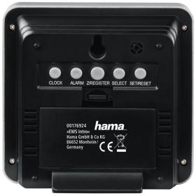 Hama Wetterstation EWS Intro für die Anzeige von Temperatur, Zeit, Datum und Wochentag • Batteriekapazitätsanzeige • Anzeige von Innen- und Aussentemperatur • umschaltbar zwischen °C und °F • Speicherung der max. und min. Temperaturen innerhalb eines Tages • Trendanzeige der Temperatur • Uhr-/Kalender-/Weckfunktion • Uhrzeit umschaltbar zwischen 12- und 24-Stunden-Format • Wochentagsanzeige einstellbar in Englisch, Deutsch, Französisch, Spanisch und Italienisch • Anzeige des Datums • Alarm- und Schlummerfunktion • Lieferumfang: Wetterstation, Sensor, 4x Batterien AA, Bedienungsanleitung
