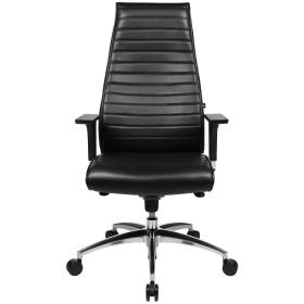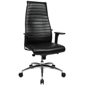 Der Topstar Chairman X ist ein hochwertiger, robuster Chefsessel aus Leder. Die hohe Rückenlehne des Chariman X Bürodrehstuhls ist höhenverstellbar und kann so auf das gewünschte Mass eingestellt werden. Die komfortable Synchronmechanik zur synchronen Verstellung von Sitz- und Rückenlehnenneigung und die individuell auf das Körpergewicht einstellbare Federkraft ermöglichen ein dynamisches und ermüdungsfreies Sitzen. Die bequeme Ledersitzfläche des Muldensitzes ist stufenlos in der Höhe verstellbar. Der Topstar Bürostuhl ist mit höhenverstellbaren Kunststoffarmlehnen versehen und mit einem stabilen Fusskreuz aus poliertem Aluminium mit lastenabhängig gebremsten Teppichbodenrollen ausgerüstet. Der Topstar Chefsessel wurde mit dem GS Zeichen versehen und erfüllt somit sämtliche sicherheitsrelevanten Voraussetzungen. Die 3-jährige Herstellergarantie versichert eine ausgezeichnete Qualität und eine lange Lebensdauer.