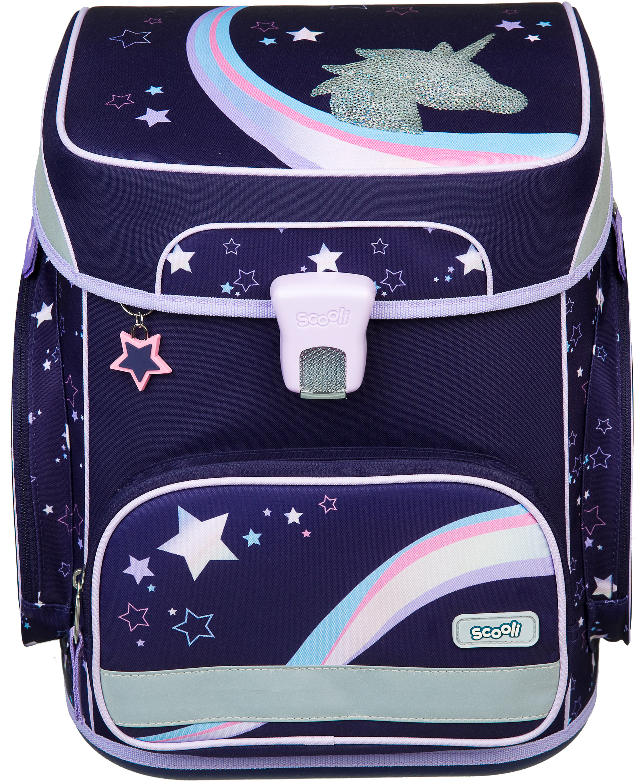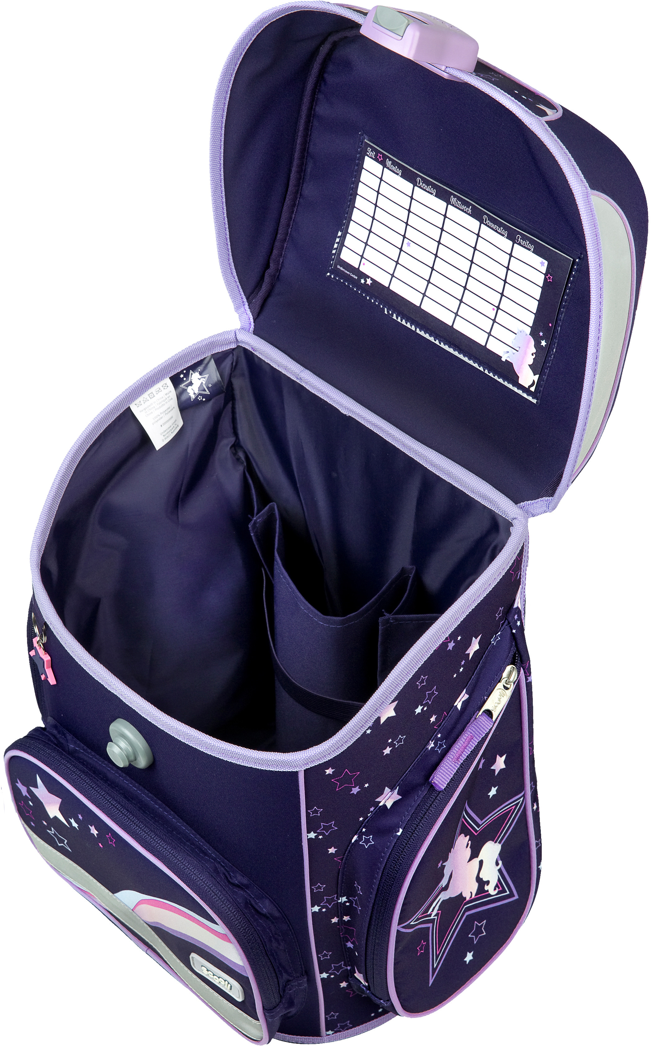 Set bestehend aus: Schulranzen (Effekt: Silkscreen Print, Gewicht ca. 1.000 gr., Volumen ca. 18 Liter, abnehmbarer Brustgurt, gepolsterter ergonomischer Rücken, Brustgurt, Reflektorflächen, Magnetschloss, uvm.), Schlüsselanhänger, Schlamperetui, Schuhbeutel, Schüleretui mit Eberhard Faber Füllung Polyester, 1 Stück im Polybeutel
