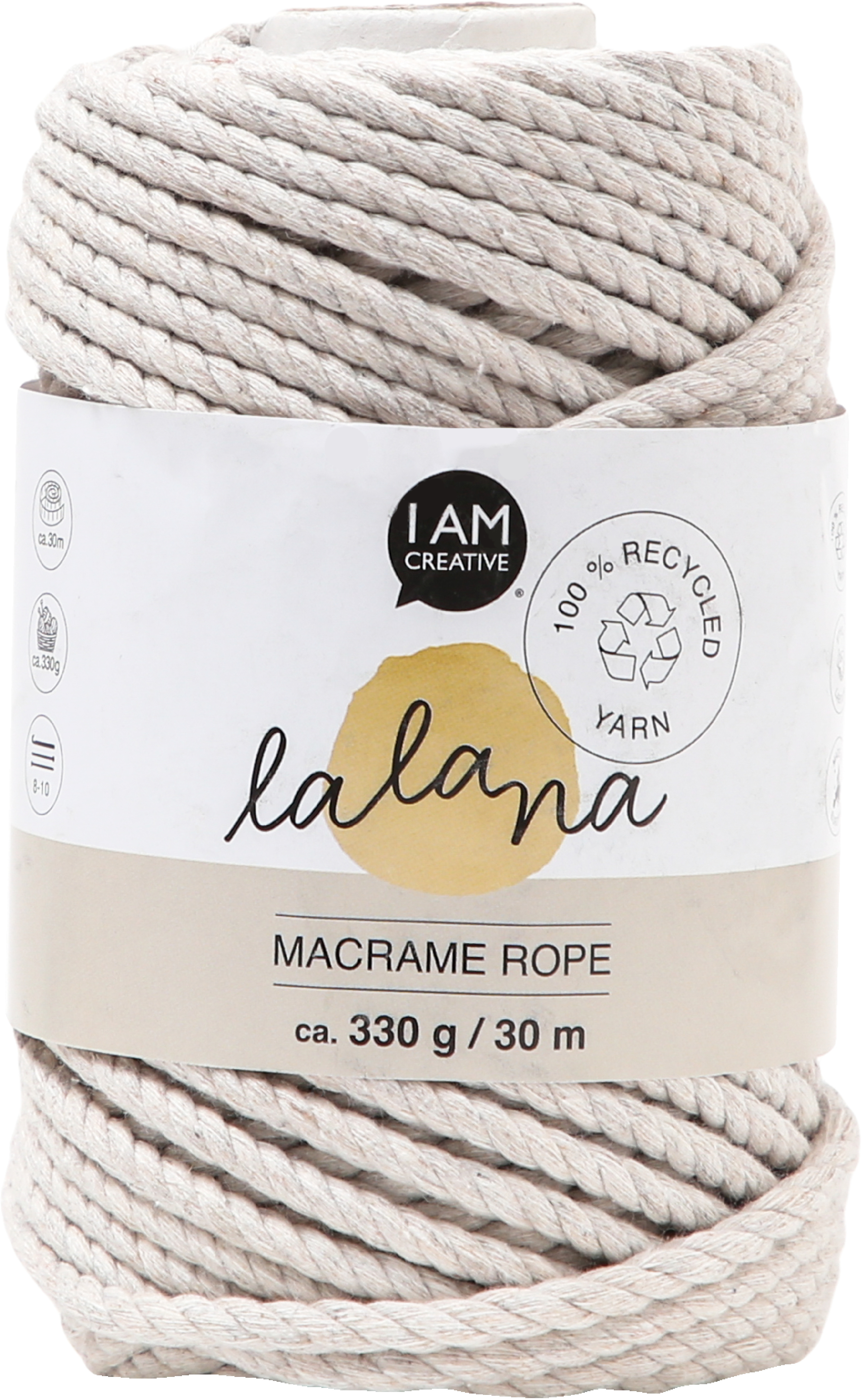 lalana Macrame rope 5 mm ist die typische 3-strängig gedrehte Makramee Kordel. Damit gelingen Makramee Arbeiten wie Wanddekorationen, Blumenampeln, Schlüsselanhänger usw. ganz bestimmt. Auch Armbänder und Halsketten können damit hergestellt werden.