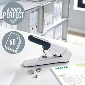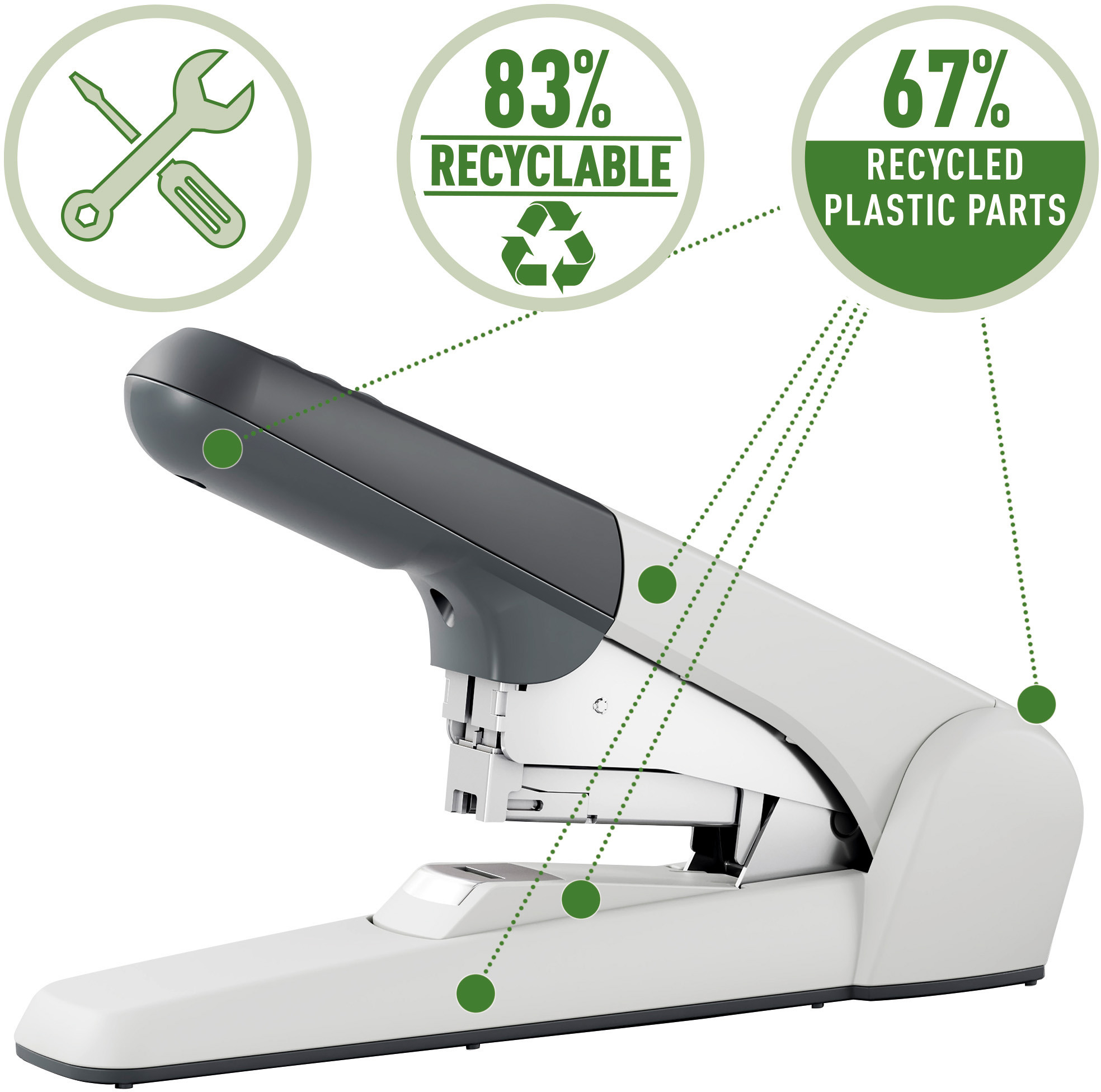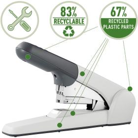Hochwertiger Hochleistungshefter mit Flachhefttechnologie zum Heften von bis zu 60 Blatt Papier (80 g/m²). Dieser starke und langlebige Hefter heftet mühelos und präzise große Dokumente, während die Flachhefttechnologie Papierstapel reduziert, um Platz in Ihren Akten und Ordnern zu sparen. Das Sichtfenster für die Heftklammern zeigt an, wann der Hefter nachgefüllt werden muss, und der Nachfüllmechanismus an der Vorderseite ist schnell und einfach zu bedienen. Dieses robuste Heftgerät ist aus Metall mit einem kleinen Anteil an recyceltem Kunststoff hergestellt und kann mit Ersatzteilen repariert werden, um die Lebensdauer des Geräts zu verlängern. Am Ende seiner Lebensdauer ist das Gerät zu 83% recycelbar, wenn es vollständig in die verschiedenen Materialtypen zerlegt wird, um Abfall zu reduzieren und die Ressourcen der Erde zu schonen. Der Leitz 5552 Hochleistungshefter hat eine Garantie von 10 Jahren, wenn er mit Leitz Heftklammern verwendet wird und ist GS-geprüft. Zusätzlich bieten wir Ihnen passende Produkte für Ihren Bedarf an Hochleistungs-Heft- und Lochgeräten an.