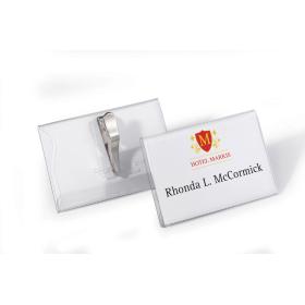 Die Krokoklemme ist drehbar, dadurch ist auch ein seitliches Anbringen am Revers möglich. Mit auswechselbarem blanko Einsteckschild. Aus Hartfolie.