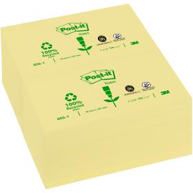 Post-it® Recycling Notes werden zu 100 % aus Recyclingpapier hergestellt. Diese Haftnotizen stammen aus zertifizierten, erneuerbaren Quellen und nachhaltiger Forstwirtschaft mit dem Siegel PEFC RECYCELT. Sie verfügen über Klebstoffe aus 60 % Haftkleber auf Basis jährlich nachwachsender Pflanzen. Die gelben Blöcke sind in einer Vorratspackung erhältlich, die sich leicht öffnen und in einem Schreibtisch oder Schrank aufbewahren lässt, sodass die Blöcke sofort griffbereit sind. Diese Haftnotizen haben das Format 76 x 76 mm und sind in einer Packung mit 16 Blöcken à 100 Blatt erhältlich. Zur Verringerung des Verpackungsmaterials wurde auf das Einschweissen der einzelnen Blöcke mit Folie verzichtet.