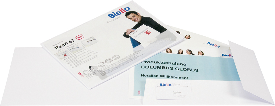 Präsentieren im Querformat - die Offert- und Präsentationsmappe Pearl #7 von Biella macht dies möglich. Die 2 Innenklappen schützen die Unterlagen und bieten Platz für die Einlage Ihrer Visitenkarte. Die Sichttasche auf dem Vorderdeckel dient zur Einlage eines individuell gestalteten Deckblattes. Ideal für Präsentation und Dokumentationen.