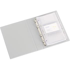Das Spezialzeigebuch Visit DeLuxe ist für die Ablage von Visitenkarten ideal geeignet. Der Einband ist aus strapazierfähigem und elegantem DeLuxe Material. Die Ringbügelmechanik, 4 Ringe 45/65/45 mm, ist vernickelt und mit einem Niederhalter ausgestattet. Das Zeigebuch ist anwendungsbereit ausgestattet mit einem LongLife Register A-Z und 24 Zeigebuchtaschen für je 6 Visitenkarten (bis 105 x 65 mm).