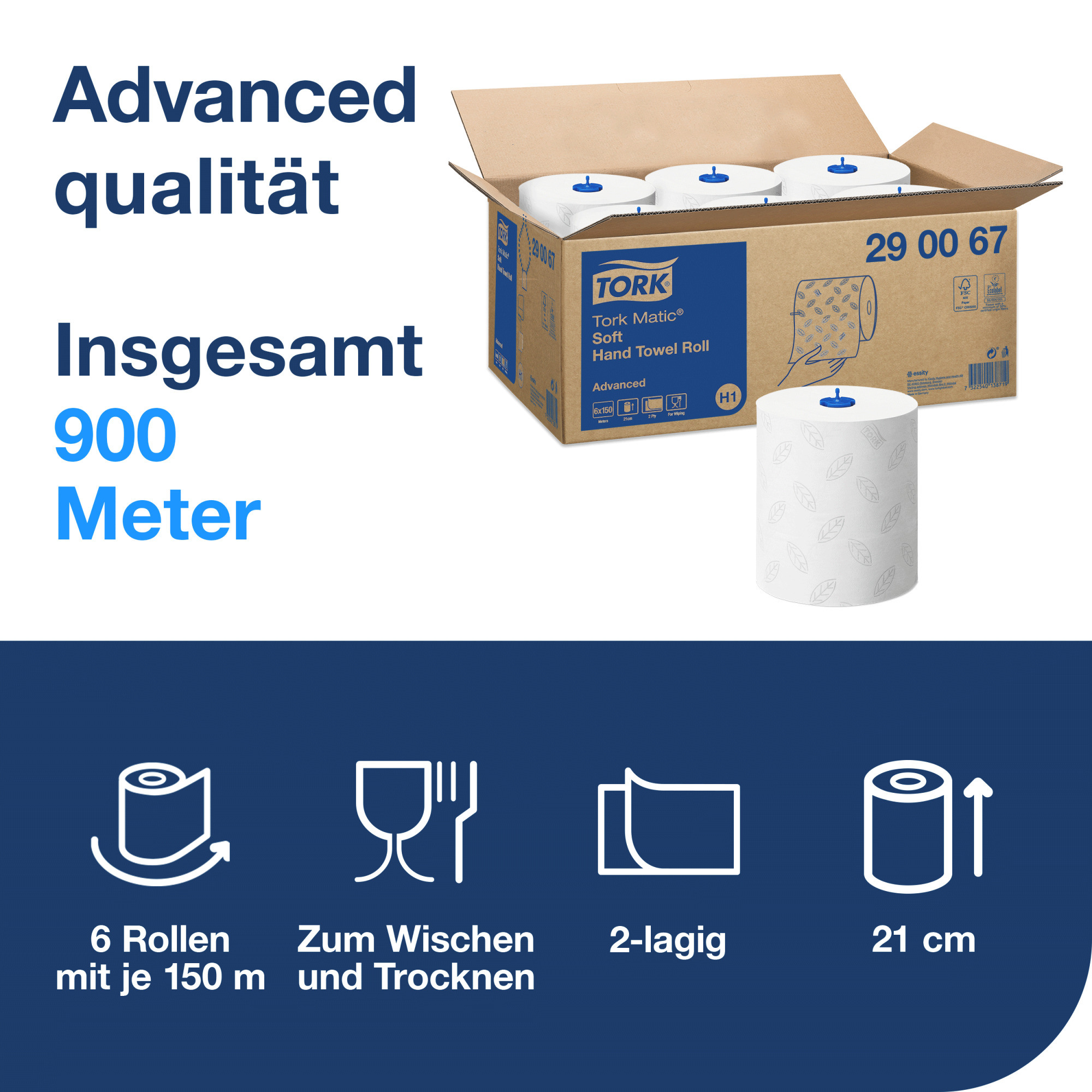 Verwöhnen Sie Ihre Gäste mit dem Tork Matic® weichen Rollenhandtuch Advanced. Es zeichnet sich aus durch gutes Händetrocknen und hat ein schönes, aufgeprägtes Blattmuster in Grau. Diese Handtücher eignen sich für die Tork Matic® Spender für Rollenhandtücher, die für die leichte Wartung in Waschräumen mit hoher Besucherfrequenz entwickelt wurden. Das spart Zeit und kontrolliert dank der Einzelblattausgabe auch den Verbrauch.