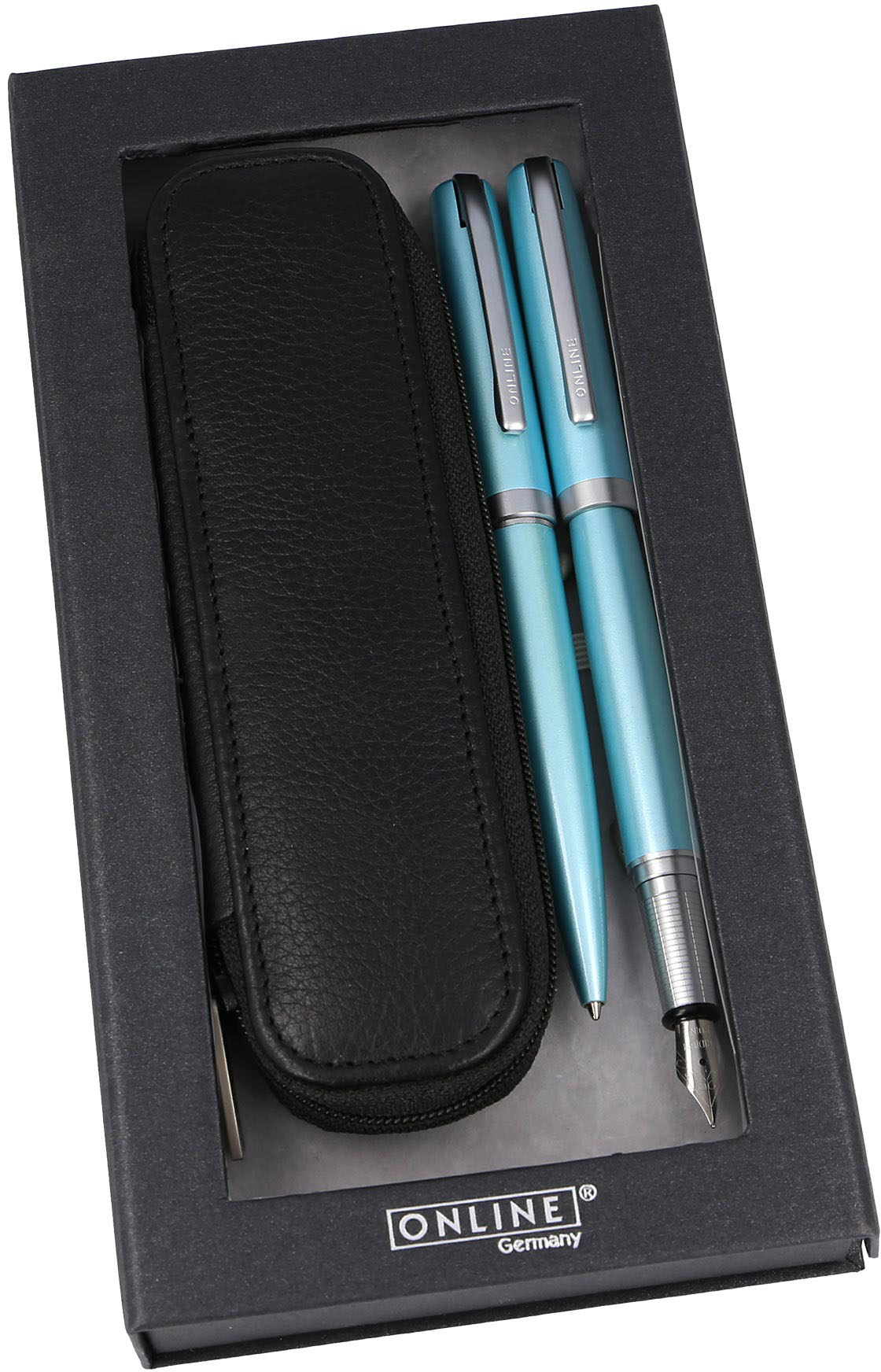 Das Eleganza Geschenkset von ONLINE, Metall-Füllhalter und Kugelschreiber, in ausgewogenem Design. Der Eleganza Füllhalter ist ausgestattet mit einer hochwertigen Iridium-Feder M (mittel). Auf die edle Iridium-Feder gewährt ONLINE 5 Jahre Garantie. Nachfüllbar mit Standard Tintenpatronen (zwei kurze Patronen oder eine lange), Konverter-Einsatz möglich. Der Kugelschreiber enthält die hochwertige Original ONLINE Grossraummine, Schreibfarbe Schwarz, nachfüllbar. Dieses Schreibgeräte-Set garantiert Schreibvergnügen pur. Zusammen mit einem hochwertigen Echtleder-Etui verpackt ist dieses Set die perfekte Geschenkidee.