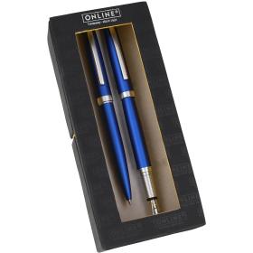 Das Eleganza Geschenkset von ONLINE, Metall-Füllhalter und Kugelschreiber, in ausgewogenem Design. Der Eleganza Füllhalter ist ausgestattet mit einer hochwertigen Iridium-Feder M (mittel). Auf die edle Iridium-Feder gewährt ONLINE 5 Jahre Garantie. Nachfüllbar mit Standard Tintenpatronen (zwei kurze Patronen oder eine lange), Konverter-Einsatz möglich. Der Kugelschreiber enthält die hochwertige Original ONLINE Grossraummine, Schreibfarbe Schwarz, nachfüllbar. Dieses Schreibgeräte-Set garantiert Schreibvergnügen pur. Zusammen mit einem hochwertigen Echtleder-Etui verpackt ist dieses Set die perfekte Geschenkidee.