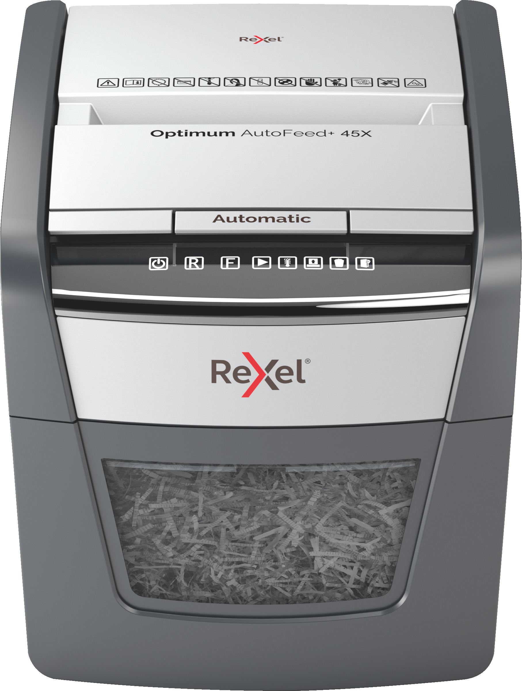 Der Optimum AutoFeed 45X Partikelschnitt-Schredder zerkleinert automatisch bis zu 45 Blatt A4 Papier (80 g / m²) in einem Durchgang in Sicherheitsstufe P4 kleine Partikel (4 x 28 mm). Dieser AutoFeed Aktenvernichter ist aufgrund des kompakten 20 Liter Abfallbehälters ideal für den Einsatz Zuhause oder im Home Office geeignet. Sie müssen weder Papier einzeln manuell einführen noch Heft- oder Büroklammern entfernen. Er erledigt die gesamte Arbeit für Sie.